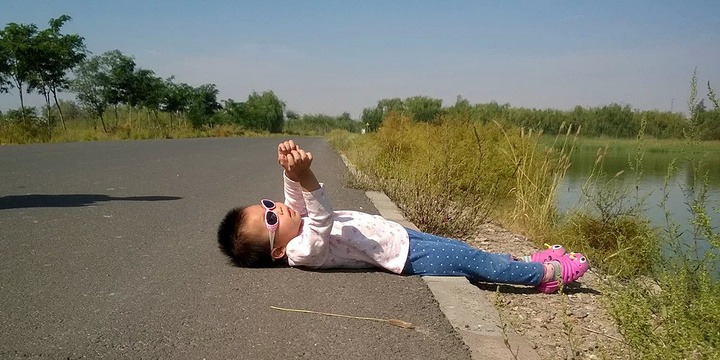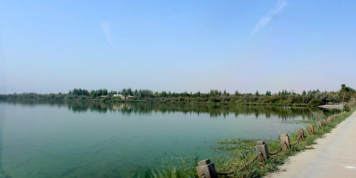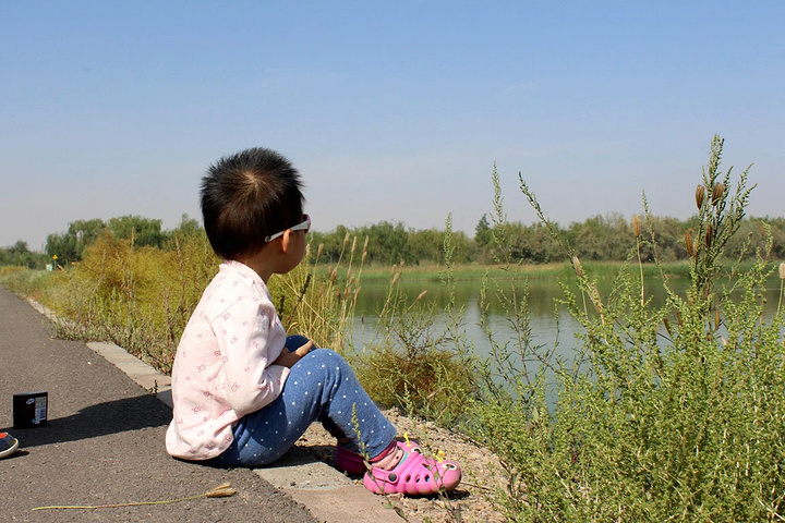 差不多十点到的第一个景区-腾格里湖湿地景区,100元。这里是可以选择自驾和乘坐观光车。因为我们后面还要去通湖草原,花了30元给车也买了票,游玩结束后从另一个出口直接去通湖,可以节省十几公里的路。虽然景区很大,但车道较窄,只能过一辆车,所以分2条不同的路线,都只能往一个方向走,不能调头。北线是只看景,南线是可以看爸爸去哪儿拍摄过的现场。我们选择了美景线,当天没什么人,车可以随走随停,所以也有幸可以坐在湖边发发呆,这就是错峰出游的一大好处。