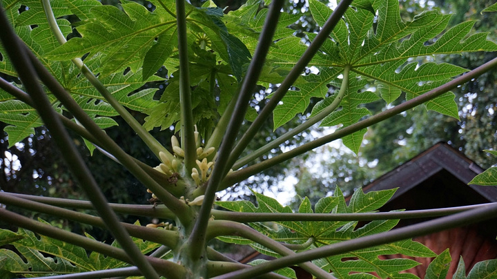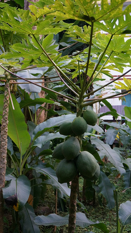 公园里面热带植物茂盛,大树参天,非常凉爽。湖水里面有很多巨大的花锦鲤,非常漂亮。这好像是木瓜啊