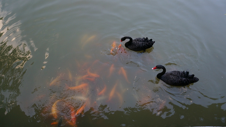 孔雀山庄旁边是一片碧绿的湖水,里面有两只黑天鹅和成群的鸳鸯。湖水里面有很多巨大的花锦鲤,非常漂亮。孩子的兴趣在于给黑天鹅喂食,投下面包,引来黑天鹅和大锦鲤之间的争抢。