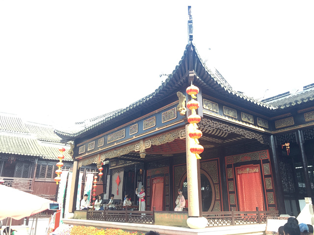 与西塘不同,周庄现在还居住着大量的原住民,这在已经开发的景区中算是最多了。游客的到来多多少少对他们的生活有些影响,不过逛了会发现,这些周庄居民正在用他们的方式欢迎着五湖四海的游客,慢慢熟悉和适应这样的生活方式。江南旧时有不少的民俗文化,周庄也保留着许多这样的手工工艺,称之为“周庄十二坊”。 一进景区就看到人山人海,走了几步便有一个秦腔戏,于是进门,还没开始。等了十分钟左右,戏子出来了。听了几句就走,因为一句都听不懂··