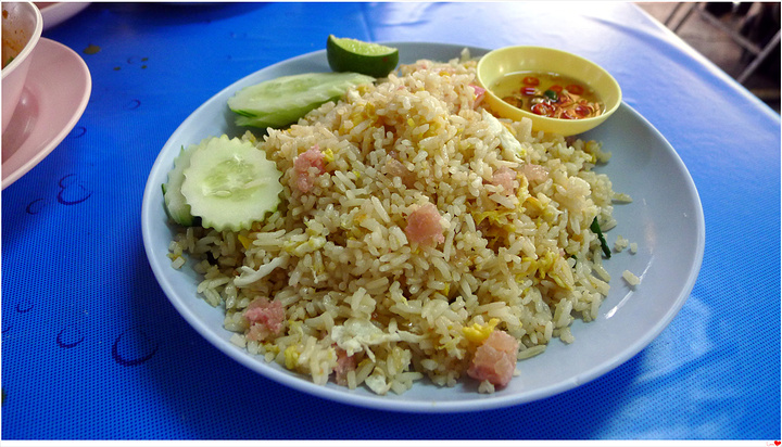 吃了以上这些饭后 妈妈觉得分量小 不够吃 又看别桌都在点炒饭也让我点了一份 于是给爸爸点了一个泰式香肠炒饭 里面那粉扑扑的看着像面团子的就是泰式香肠 哈哈 虽然香肠很水 不过炒饭不错哦