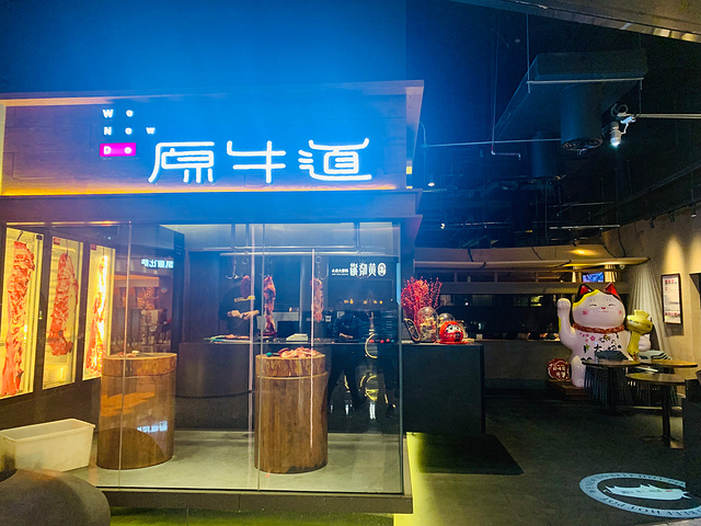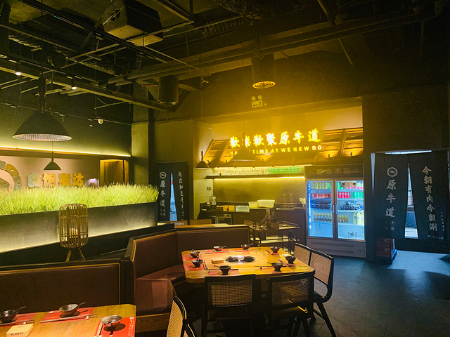 🥂环境 进了汉京金融中心B1,很轻易就能看到“原牛道”的白色灯牌招牌, 玻璃橱窗内两个圆形的切肉🔪案板加上墙边挂的几幅牛肉剖解图,把这家牛肉火锅店的主旨用最原始直接的方式展现出来。透过玻璃橱窗就能看到后边的厨房备菜间,食客可以一目了然看到厨师👨🍳们准备食材的过程。门口右侧还有个超大的招财猫🐱,笑眯眯的招揽着客人,也为餐厅招财进宝。 餐厅很大,没有大灯,暗色系配淡黄色墙灯,再加上每个餐桌上方聚焦在火锅上的照明灯,整体很有氛围感。 🍴菜品 因为是公司聚餐,两大桌人可以说是能点的肉全都点了至少一遍,每道肉菜都很厚实,并且都有一个小牌子告诉食客这是什么肉,大概需要涮多长时间。我格外喜欢丸子🍡,个头大,有嚼劲,一口咬下去溢出汁水,很饱满。方形盘子🥏设计的很聪明,可以摞得很高但不太占空间,吃饭的人多,但是一点不会觉得空间紧凑。 💁服务: 来的时候客人还不多,每一个餐桌的桌边柜、碗筷🥣🥢、餐具都很统一的摆放整齐,看得出服务人员训练有素。我们在包房里,菜品更换的很快,服务员也是不断进出,添菜添水,还把调料特意组了小盘,以免我们进出不方便。 📍位置&交通: 这家店在汉京金融中心的B1,公交🚌车站深大北门2下来就是,地铁🚇不算方便,深大站下来还有步行900米,自驾🚗很合适,因为大厦有自己的停车位🅿️。