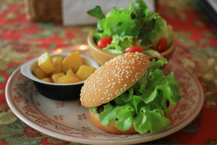 Teriyaki Burger 非常有意思的素菜荤做以及混搭创意, 随汉堡一同上来的还有清爽的色拉以及煎土豆和两枚腰果。