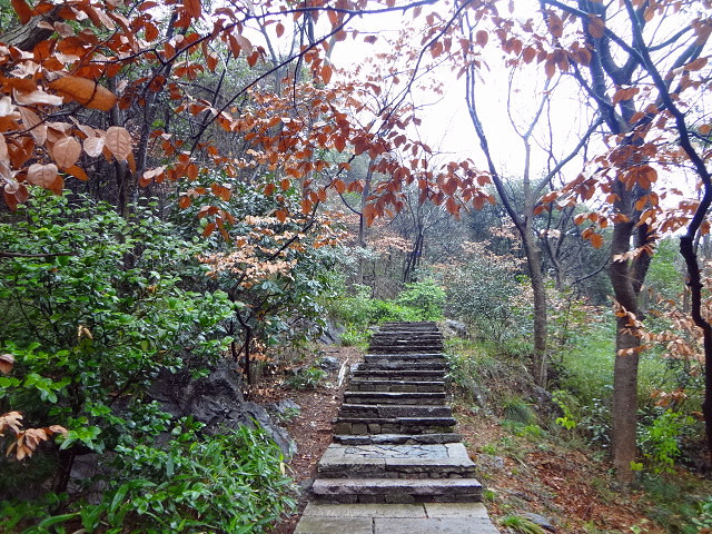 一共1260个台阶,空气真的还挺不错,也有可能是因为下着雨吧。一路上遇到的几个人,感觉都像是本地人来锻炼的,如果住在杭州,周末来爬爬这个小山,还真挺不错的哦~