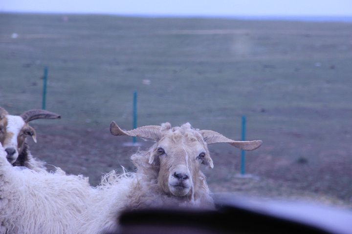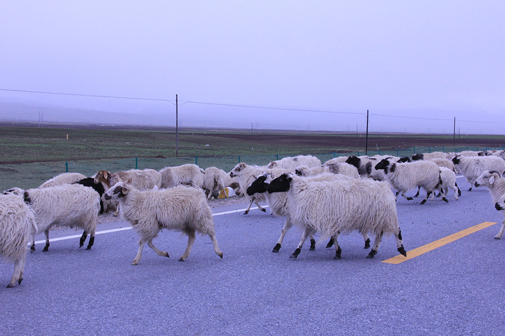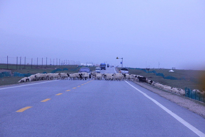 过马路的羊群,这是在环湖路上的一道风景线。这种感觉就想小学生手拉手过马路一样,整齐有序。不过羊咩咩似乎没有手的哈