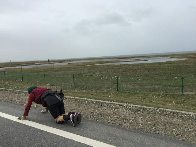 虔诚如这个阿婆,听可可西里说这样跪一圈得十天半月的。他们朝圣就是为了向神明表达自己的敬畏和崇敬。藏民们很富但也很穷,看那漫山的牦牛和羊,一直牦牛的价格都是七八千元,每家也有上百头或者近千头的牦牛,所以他们很富。可是这些钱于他们都是数字,没有半分意义。每年去朝圣,留下一点生活费剩余的钱全部捐给寺庙,所以他么很穷。在信仰面前,任何试图去分析他们的科学,心理学都是非常low的。而她的身影在这360公里的青海湖边随处可见。