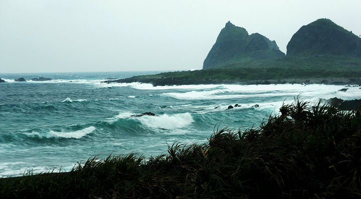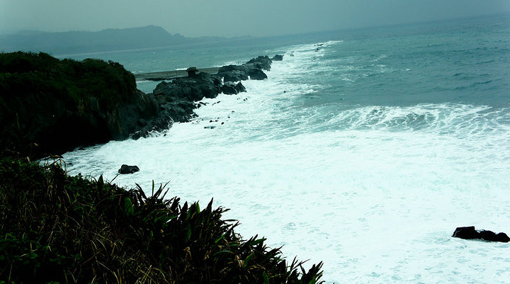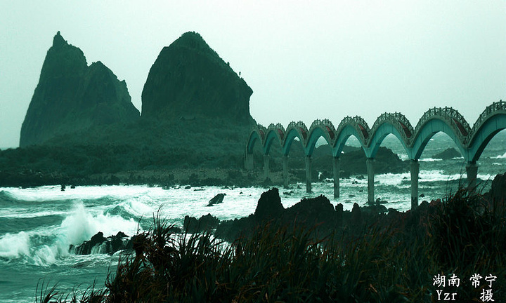表弟介绍前面要去台东县的一处“水往上流”的景观,我们说:这怎么可能?地球的地心吸引力决定了水只能往低流。他笑答:真是这样,是世界奇迹,你们不信到了那里就明白啦。 车在前面不远处离开国道往左走上山路,不几时便到达景点停车场。只见车场停有几台旅游大巴,游客散落在景区各处,看情形都在仔细观察、研究、拍片。我同样从不同角度观测,研考并拿出DV拍下视频(因该地貌图片不便表现而只拍了视频)。后从看资料介绍才相信是地貌高差造成的视差。这时表弟才抿嘴一笑。 【水往上流奇观位于花东海岸公路旧道路,都兰村的渔桥附近,由都兰南行1.8公里,于公路西侧即可望见。「水往上流」的现象发生在路旁的农田灌溉沟渠,潺潺水流顺着水沟蜿蜒往高处流去,令人啧啧称奇。】 车行至“台东三仙台”景区,【台东三仙台 位于台东县成功镇东北方约3公里处,是由离岸小岛和珊瑚礁海岸构成的特殊景观区,也是东海岸最具知名度的风景点。全岛面积约22公顷,最高点海拔约77公尺,相传古时铁拐杍,吕洞宾、何仙姑曾于岛上停憩,故名三仙台岛上现有造型优美的跨海人行步道桥一座,长320公尺。三仙台的八拱跨海步桥,以波浪造型呈现,气势壮观。】 这时,天下中雨风速也增大,来景区的旅游大巴游客下车后有的打伞,有的临时买雨衣冒着风雨观赏。表弟从后备箱拿出雨伞给我们,还没走到观景亭我撑的雨伞就被大风把伞骨吹断。赶紧躲进观景亭,然后掏出机子拍图片、视频。