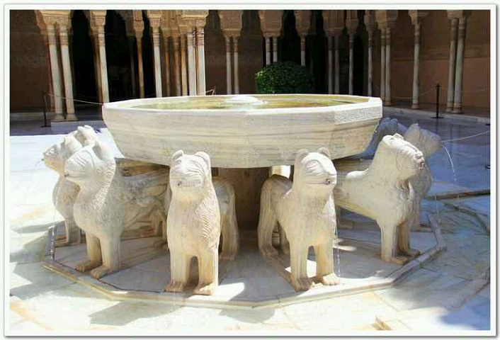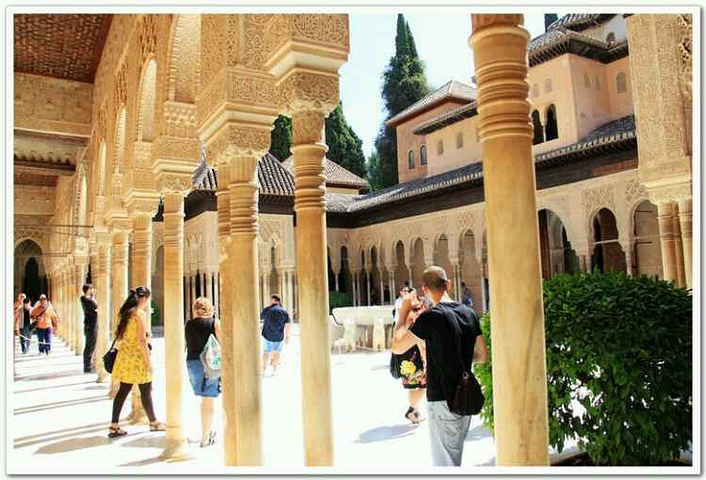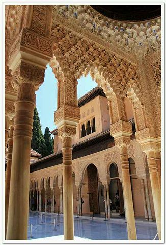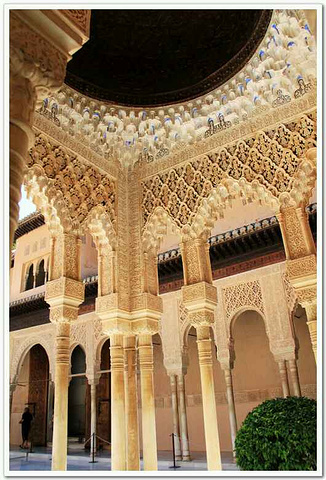 阿罕布拉宫具有浓厚的摩尔文化特点,堪称回教艺术在西班牙的瑰宝。它由一系列的庭院、天井和房屋组成,里面错综复杂的镶嵌式墙壁和天花板设计使整个宫殿的布置显得非常豪华。阿罕布拉宫被誉为世上美丽的阿拉伯式宫殿,分为皇宫、卡洛司五世宫殿、城堡和夏宫四部分。皇宫建造得美轮美奂,大殿里布满了美丽细致的阿拉伯雕塑。夏宫有阿拉伯式花园,林木青翠,喷泉点缀其中,墙面上爬满了金银花的藤蔓。树荫下有长凳,休息的同时也能享受美景。 阿罕布拉宫是西班牙著名古代宫殿,中世纪格拉纳达王国的王宫。位于格拉纳市郊,阿拉伯语意为“红堡”,为摩尔人留存在西班牙所有古迹中的精华又称摩尔宫。