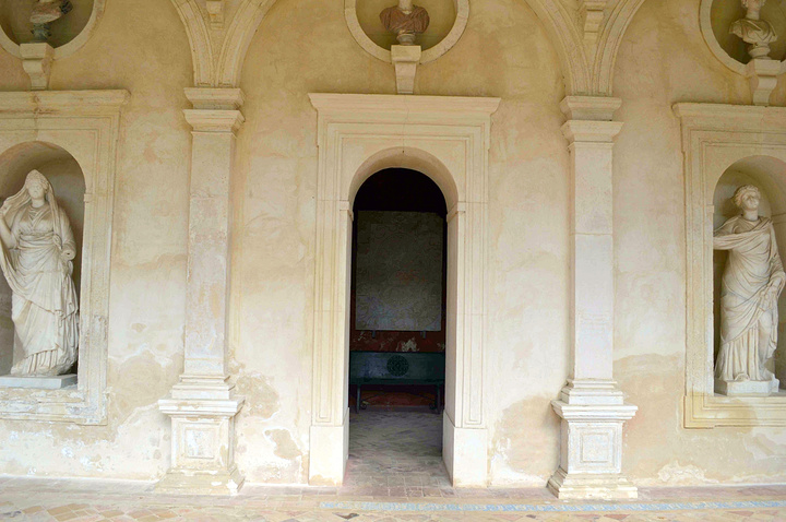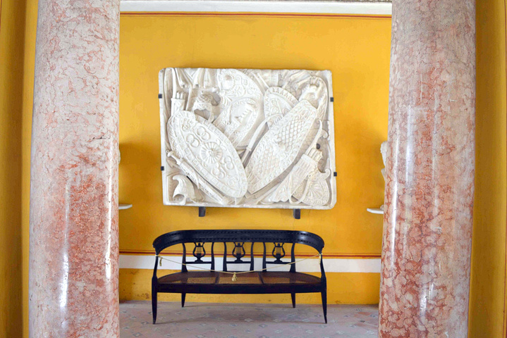 我首先参观的是右下角的花园。 进门右拐是一个空荡荡的大屋,这是该官邸最大的一间,有着漂亮的瓷砖和天花板,上面还有家族徽章。墙上的釉面瓷砖是古董,像着了魔一样凝聚了岁月的精华。照片上看着不怎么美丽,那是因为不在现场,看不到细节。我在那些瓷砖上花了很多时间欣赏,呵呵,连我自己都不相信。