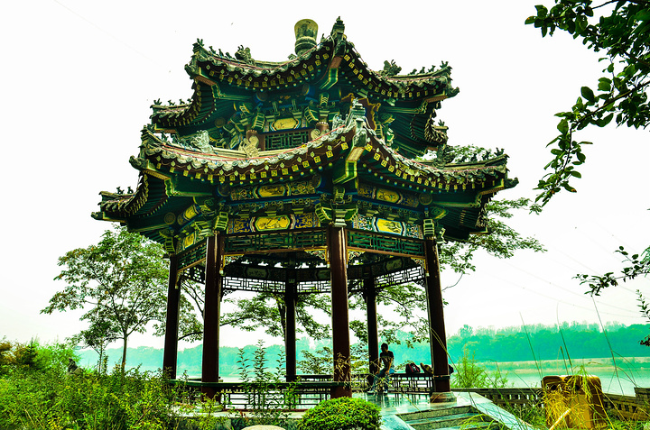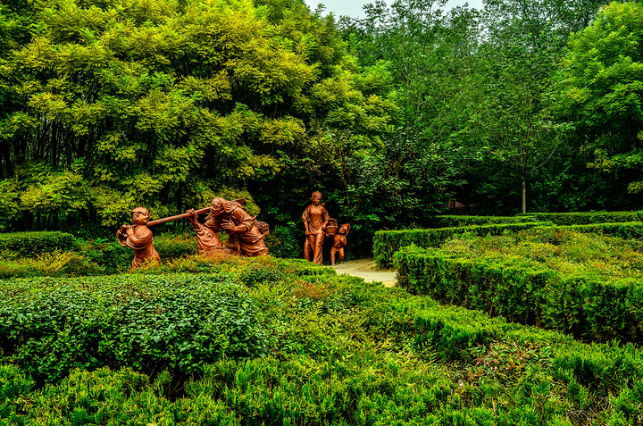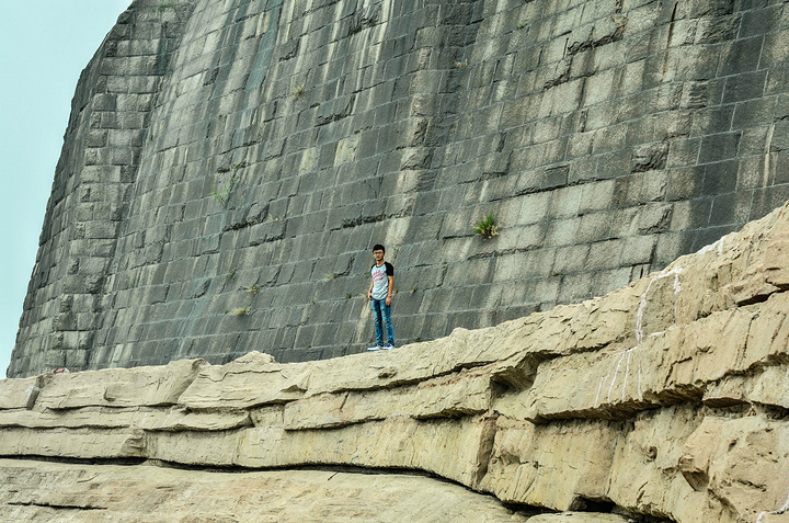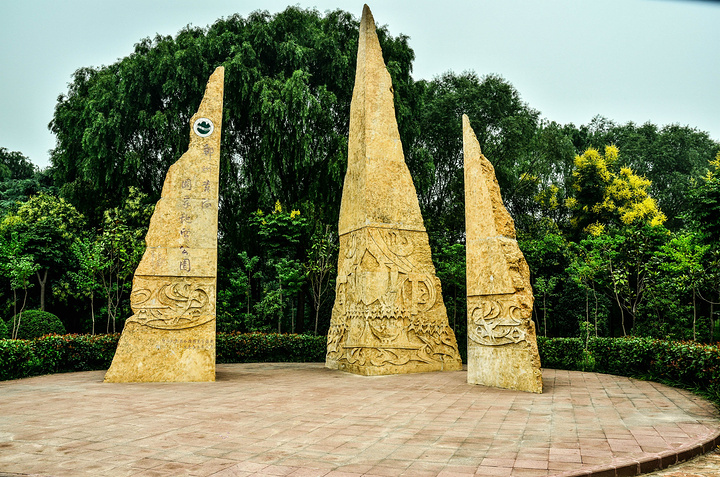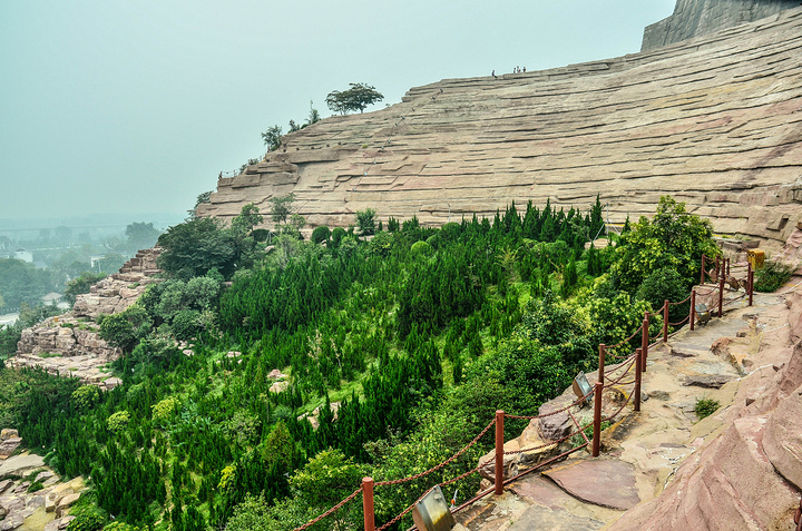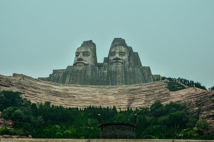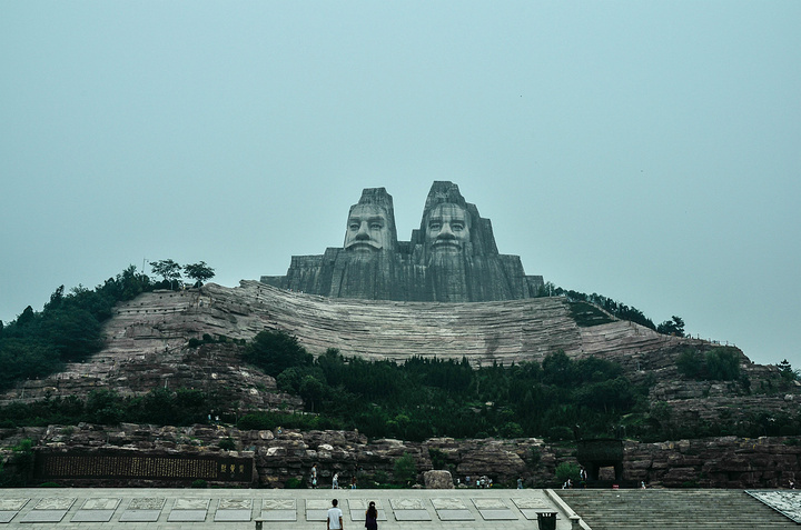 一进去就可以看见炎黄二帝的石像,你们可以猜猜左边的是黄帝还是右边的是,反正我没有认出来 、、这座石山是可以上去的,在石山的左边和右边都有路上,比较陡,走时候小心一些、、 我这朋友在我的鼓动之下,总算是站上去了、、感觉不险?往下看图片,你就会发现,他这位置在什么地方、、
