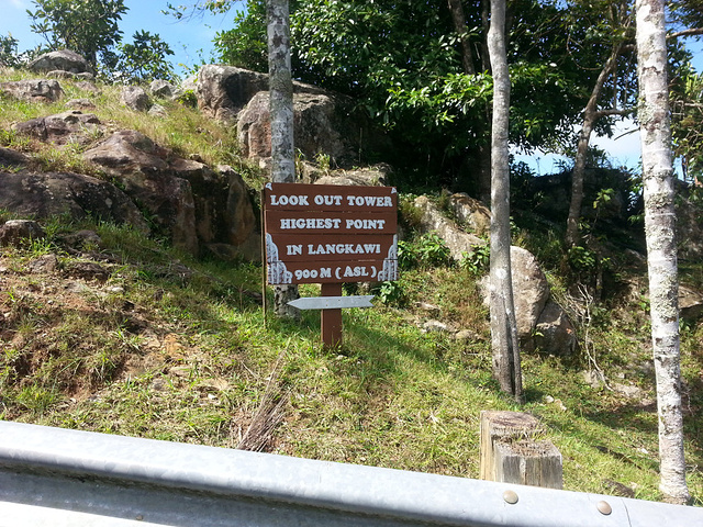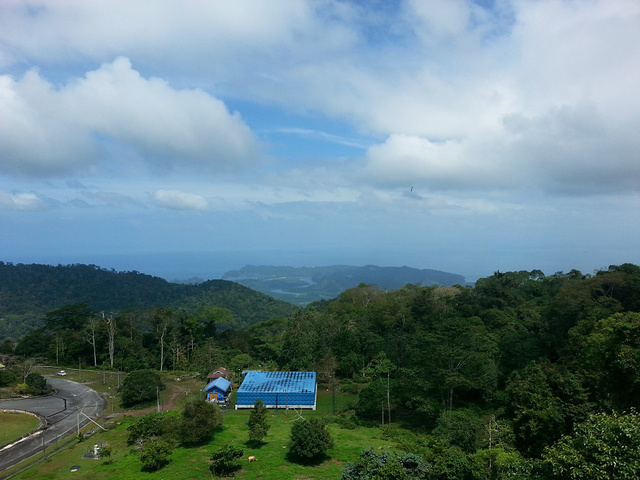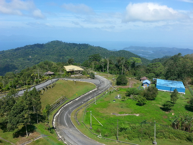 拉雅山(Gunung Raya)是兰卡威最高的山,但估计来过兰卡威的旅客中,都不知道有没有1%的人去过这个山,哈哈。其实这个山的位置很好,就在岛的中心,但是上山的入口只有一个,从机场方向往丹绒鲁海滩方向开车过去,途中就会经过了。当时我们是按着Google地图开车过去的,快到入口的时候一定要开慢点,特别留意,因为我记得那是一个很不起眼的小路口,而且还没有指示标志的。山路不是很宽敞,就是两条车道,但是几乎一直沿着山转弯,或者一直拐弯,总之没有一条长于200米的直路出现过,就要一直打方向盘。由于弯路比较多,而且山上经常出出现几只猴子在路上行走,所以一直开得很慢,就30公里左右。就这样乌龟的速度,大约30分钟,我们终于到达山顶了。沿路我们几乎没见到过一辆车,所以这个景点真心很少人去啊。不过当你到达山顶,你就发现都值得了,因为你能俯瞰大半个兰卡威和大海,真心好美好美!而且山顶上除了一个电视塔,还有一家酒店,D'Coconut Hill Resort(椰子山度假酒店),大约500人民币一晚,住在上面可能交通很不方便,但绝对是一种享受啊!