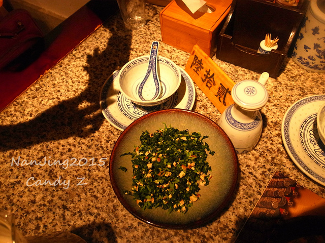 【香干马兰头】,南京的汤汤说这个是南京的特色菜之一,是一种野菜,南京人很爱吃,但是我怎么吃起来觉得就有点像生腌的大头菜,一般般也许是我们不懂欣赏它的美,剩下蛮多的。