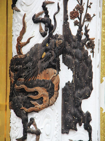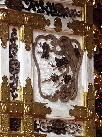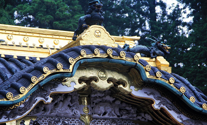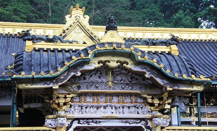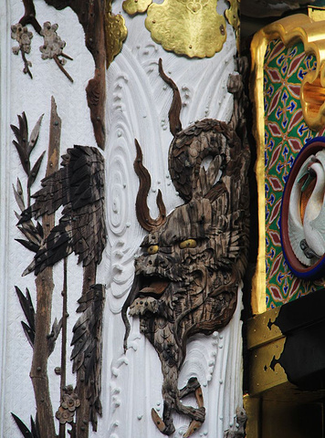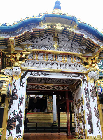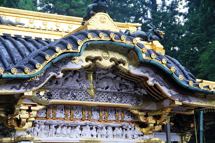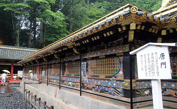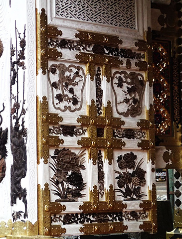 正对阳明门的,便是另一座国宝“唐门”了。整座大门用一种由天然岩牡蛎贝壳粉提炼而成的叫做“胡粉”的白色颜料漆涂而成,门上饰有各种腾龙花卉并镶以金箔,门梁上再配以各种人物典故,实在是一件既奢华又精美的艺术品。
