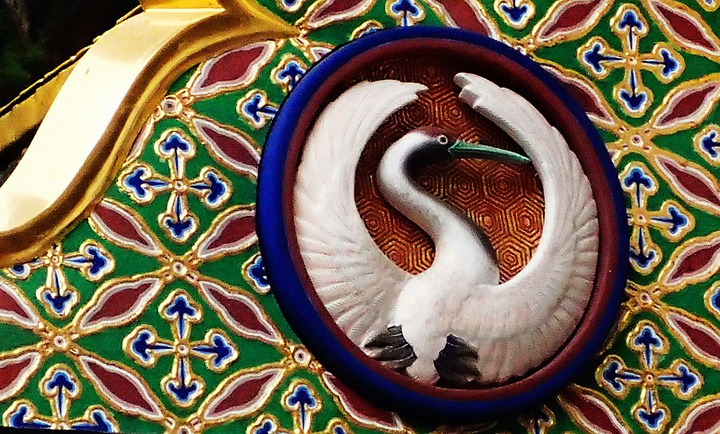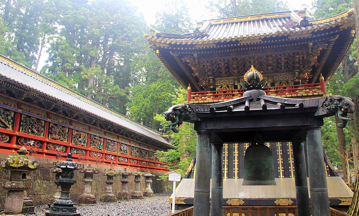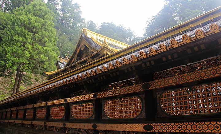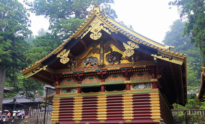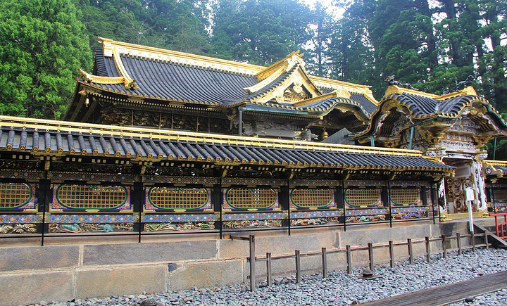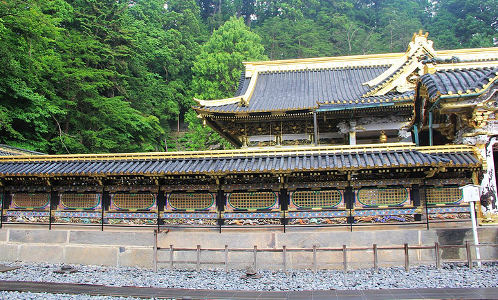 拐过净手用的御水舍,一座由九州肥前国佐贺藩(即如今的九州佐贺县)藩主锅岛胜茂于元和4年(1618年)所建的小亭子,前面就是精妙绝伦的国宝:阳明门。阳明门上刻有500多个龙,麒麟,以及诸多圣人贤士的雕刻,包括许多中国古代的圣贤。可惜,这栋称得上日本最美的大门从2013年起就开始了维修,差不多要6年才能完工,不过15年5月东照宫400年式年大祭可能会临时拆掉脚手架。 阳明门虽然看不到,但是门前两侧正对钟楼和鼓楼各有一排东照宫的国宝:五彩花鸟长廊(廻廊)。