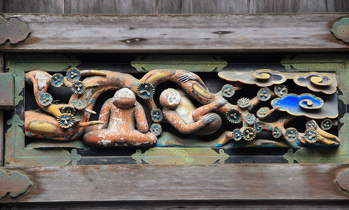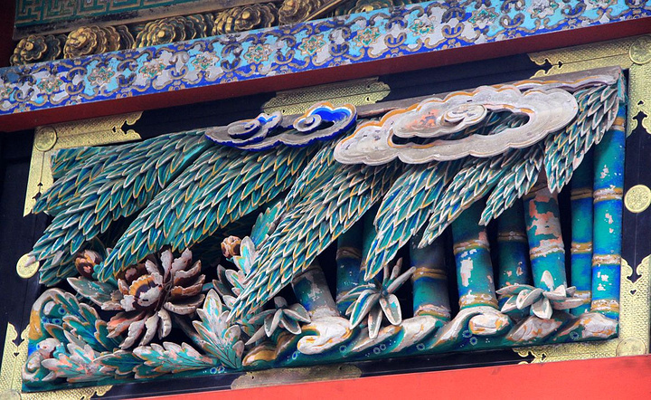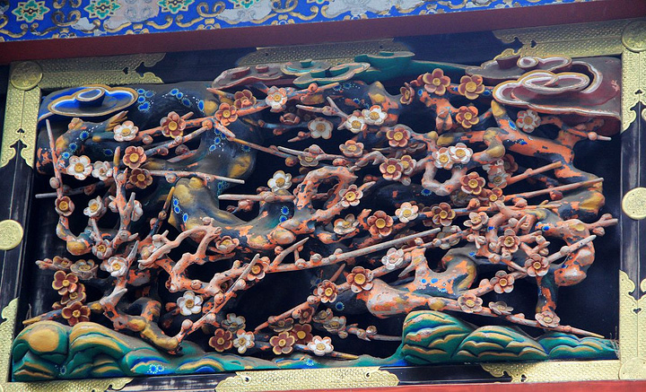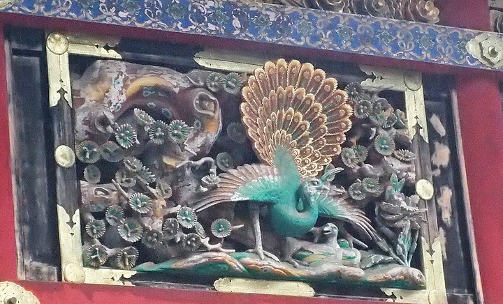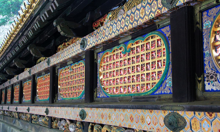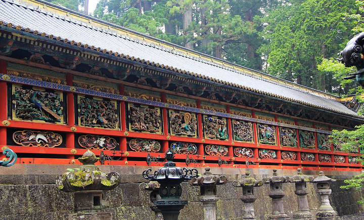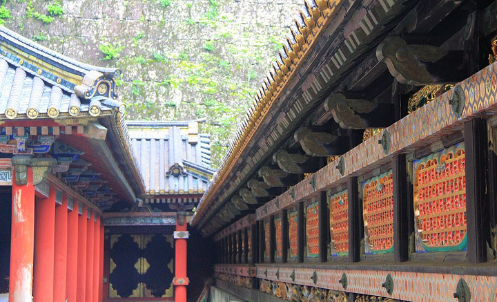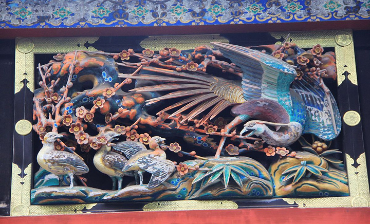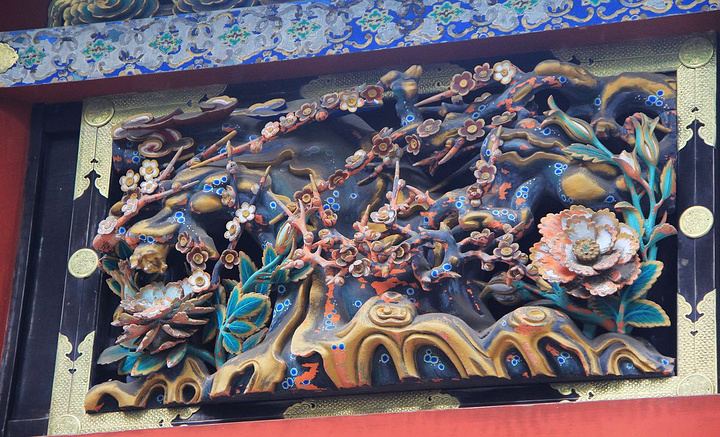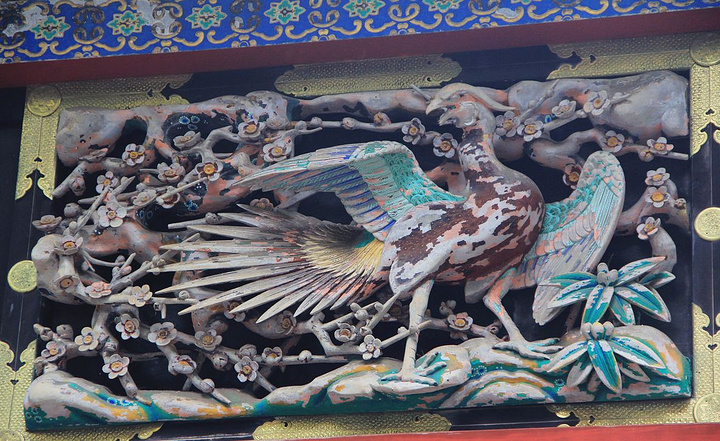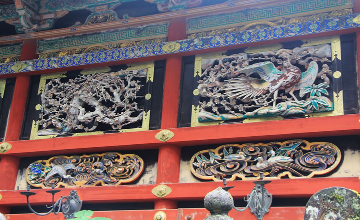 长廊两侧的墙上,有着日本最大的花鸟雕刻,无论是梅花竹子,还是松柏牡丹,抑或飞鸟孔雀,都是栩栩如生,显现了江户时代杰出的手工艺造诣。 据说德川家光在“宽永大造替”扩建东照宫时,总共动用了约12万的能工巧匠,其建筑和雕刻之奢华可见一斑。
