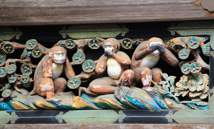 在上神库和中神库的南面,坐落着一栋马厩(神厩舎)。日本人认为猴子是马匹的守护神,所以马厩上面刻满了猴子的雕像。 东照宫的建设,受到了中国古风的深厚影响,许多建筑上的雕刻都有着浓郁的"中国元素"。就拿马厩的雕刻来说吧,著名的三猿像,一个捂着耳朵,一个堵着嘴巴,还有一个则蒙着眼睛,隐喻着典故《论语》中的“非礼勿视,非礼勿听,非礼勿言”。