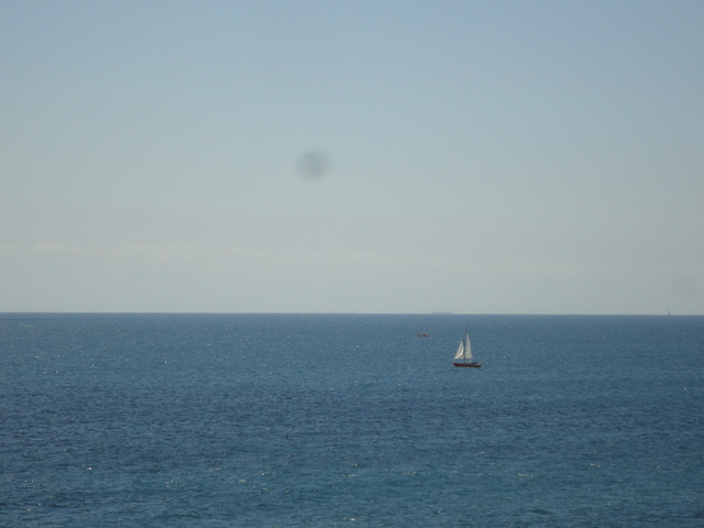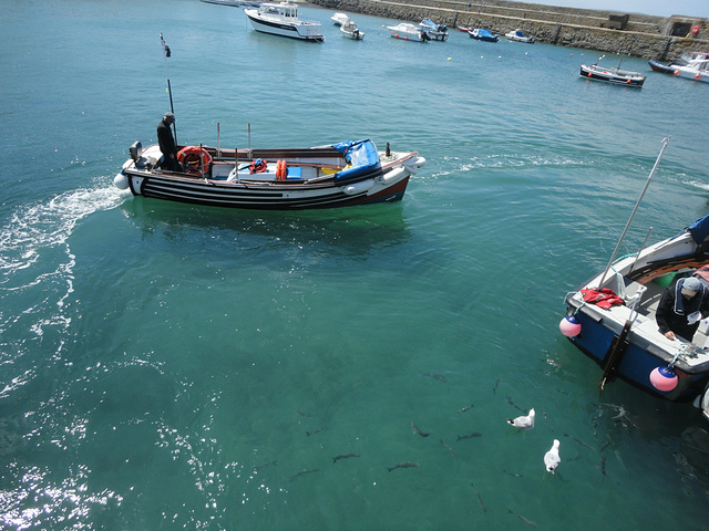 鱼儿们和海鸥都来吃东西了,海水好蓝