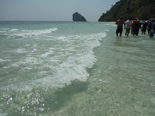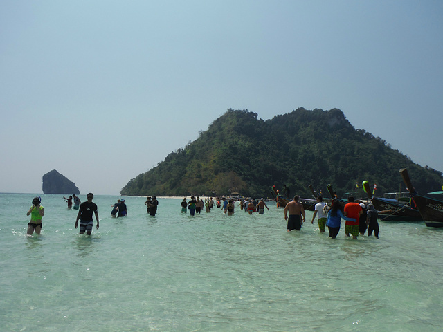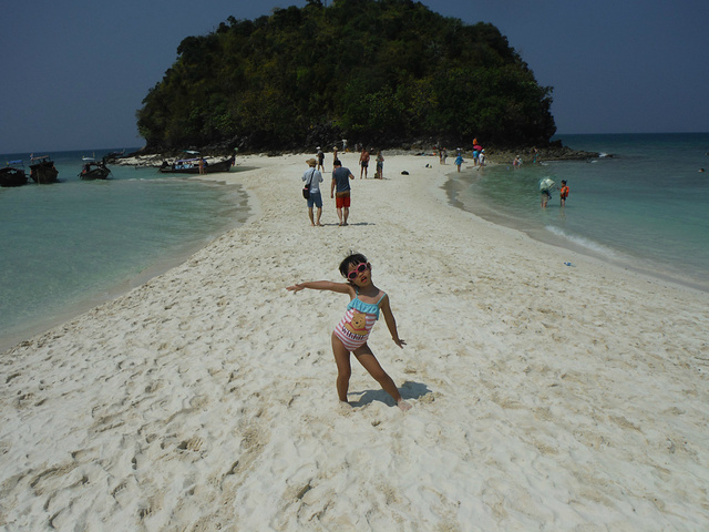 托普岛是去皮皮岛的其中一个景点之一,参加一日游可以去皮皮岛的几个海岛。托普岛的沙是白黄色的,在阳光的暴晒之下,沙滩非常烫脚。海水非常的漂亮,淡淡的蓝色,海水非常清澈,在这里不是玩浮潜,而是涉水步行,一直沿着浅滩水路走到另一个岛礁那边去。不过也可以拿着面包放在海水里面,就会有很多漂亮的五颜六色的小鱼游到你面前。这里也有一条小小的沙滩路连接对面的小岛,小沙滩路旁边停满了小船。这个岛非常漂亮。