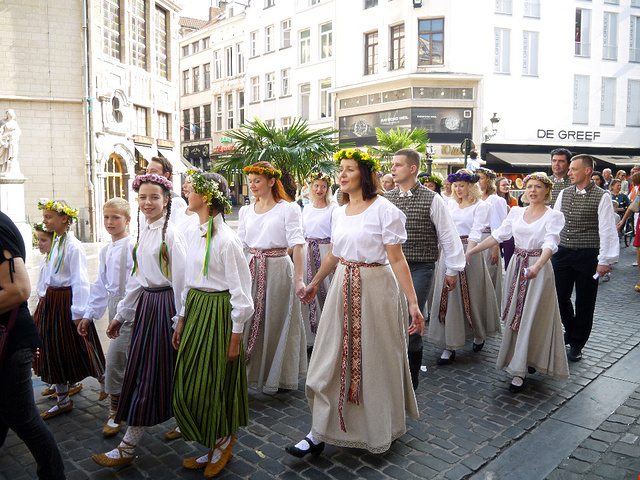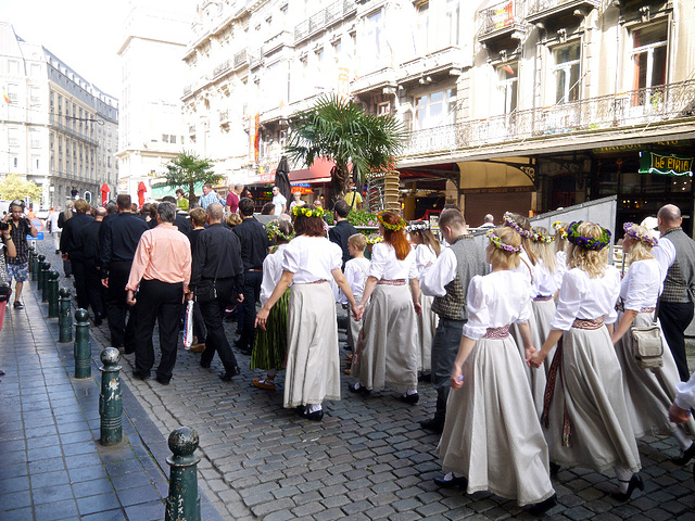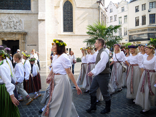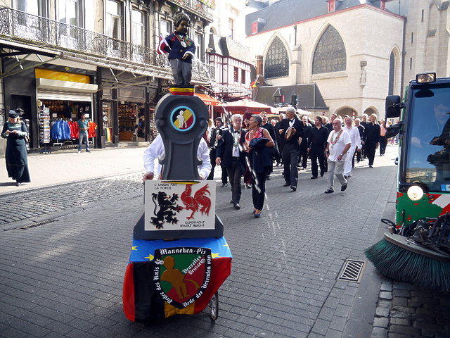 那天天气真是特别好,各种纪念比利时纪念日的活动层出不穷。在大广场周围,街上的人群,无论男女老幼,都身着比利时的传统服饰,或高声合唱,或观乐鼓舞,游客们则跟在游街队伍的后面,长长的一串,好不热闹。