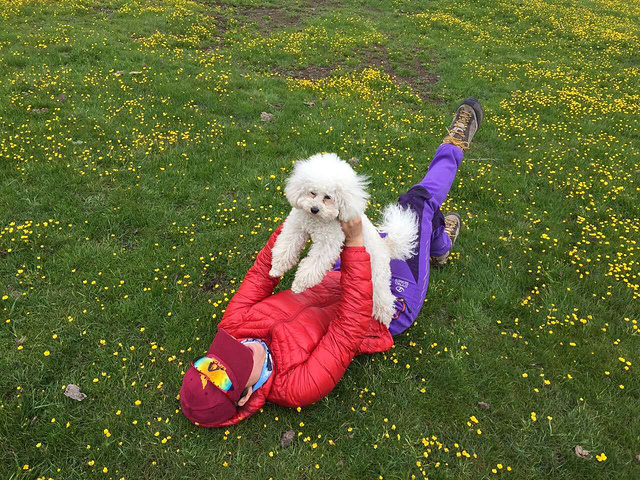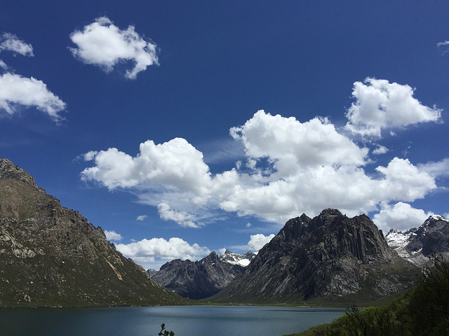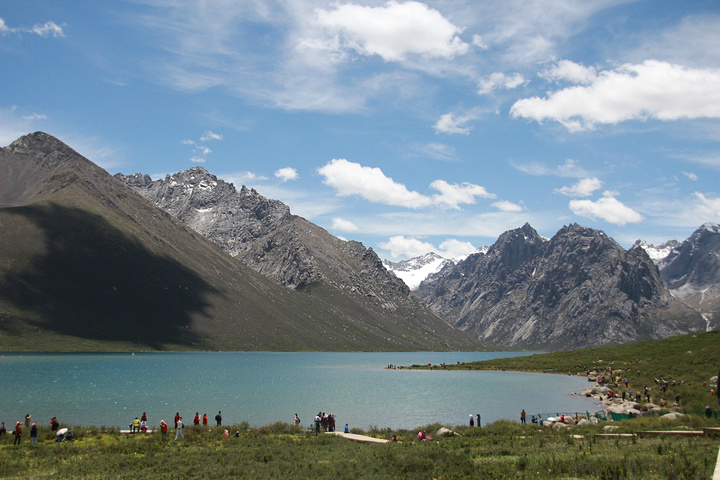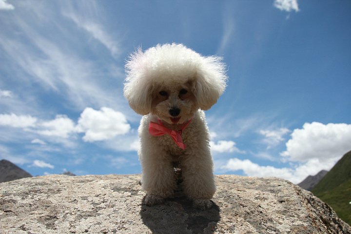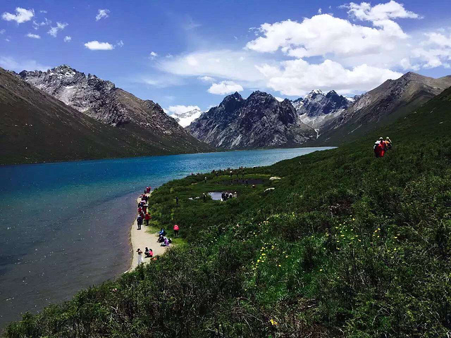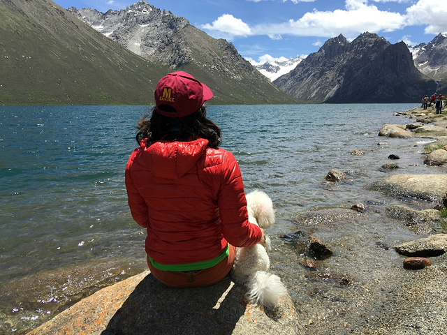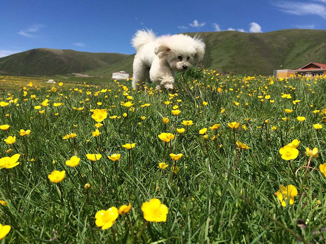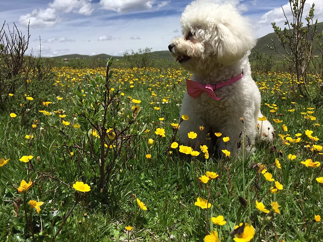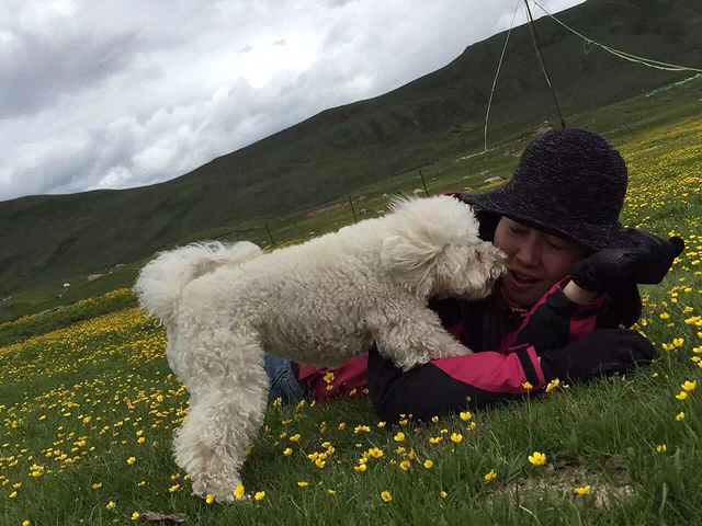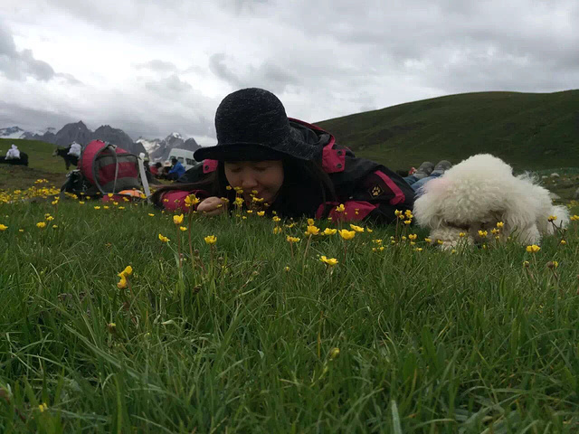我也走过了不少经典的徒步线路,云南泸沽湖徒步、虎跳峡哈巴雪山徒步、新疆禾木徒步,在徒步线路中,都排得上前十名! 但是,和年宝玉则相比,就如同是安陵容遇到了甄嬛,啤酒遇到了劲酒,家鸡遇到了野鸡!(此处有笑脸) 中午12点,抵达年宝玉则景区大门口,在售票处厕所的门口,靓靓就被满地的黄花吸引,噼噼啪啪一顿好照,急得我大呼:“里面还有更好的!” 从大门到停车场,沿途都是自驾游的车和从阿坝过来的大车,全部都停满了。今天是端午节小长假的第二天,我们猜想马不是那么好租了。 果然,马已经全部租完了。我们的计划是将大包(帐篷、睡袋、炉头等露营物质)由马驮进去,我们轻装徒步从仙女湖走到妖女湖露营!计划全程5小时,因为在海拔4000米以上的地区徒步,我们希望能省一些力气!经过和马夫交涉,马夫答应100元一个包,把我们三个包背进去!万幸万幸! 交代好行李,我们在景区吃过了中饭(只有泡面),准时于1点钟开始了徒步线路! 一走进去,就是视觉盛宴啊,远方的果洛山披着皑皑白雪,静静的守护着仙女湖,湖面碧蓝,倒映着山,倒影着云,倒映着鸟!近在眼前的大草坪上,缀满了黄色的小花,6月底的年宝玉则,是最美的——雪未化,花初开! 看了靓靓发的朋友圈,转了过来:此次同行的小伙伴小白,已经是我们四年的老朋友了,好久不见,依然如她妈一样热情依旧。每次见面都要一番强吻,擅长偷袭,不亲到嘴唇绝不罢休,都不知道跟谁学的。一路带给我们太多乐趣,在高原上,俨然一个小明星,见过它的藏民、喇嘛、居士们都忍不住摸摸它,跟它打招呼,它也非常之配合。司机小格师傅都忍不住说,小白来世恐怕是会投胎做人了。一路走来,陪我们海拔4000多徒步五个多小时,纵然高反眼睛都肿成了一条缝,依然乖巧听话,好福气的小白,愿你一直无忧可爱。
