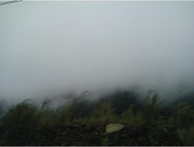 大雾,沿途有枯树、山间瀑布和雨季泥石流的痕迹。