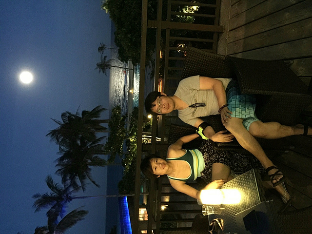第二天在酒店里各种玩,傍晚还放飞了我特意带去的大疆无人机,进行了航拍。航拍的画面美得让人吃惊。晚上在西餐厅的大露台上吃完饭,月亮从海面升起,月光洒在海上,波光粼粼。晚饭后在无边泳池里享受夜泳,太享受了。