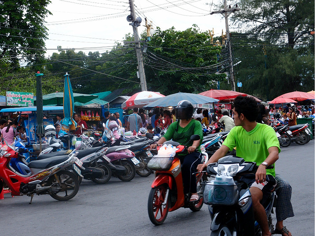 不知我是真的有福还是怎的(忘我老这么说我),每当精疲力竭的时候,最终的结局总是圆满的!这不,跨过马路,Chao Phrom Market就在眼前了。尽数的当地摊贩们都出动了,远远地看见冒着烟的、香喷喷的、人头攒动、摩托成群的画面。