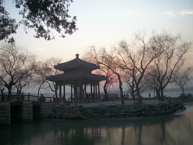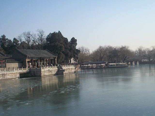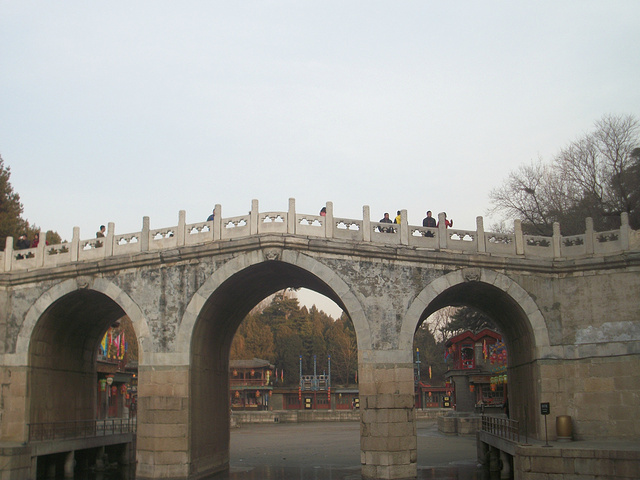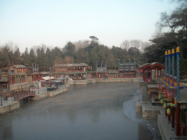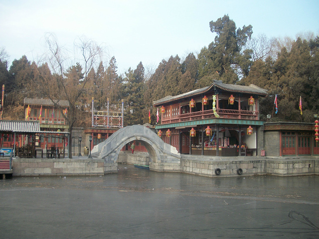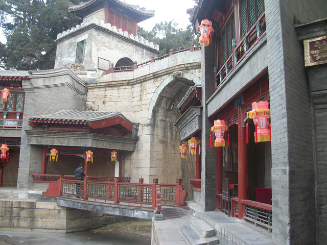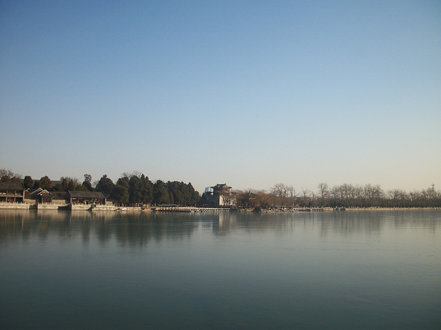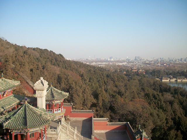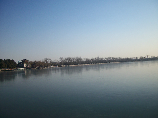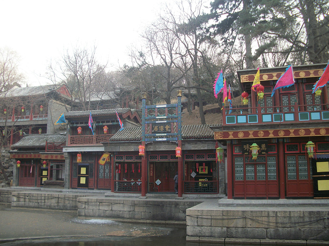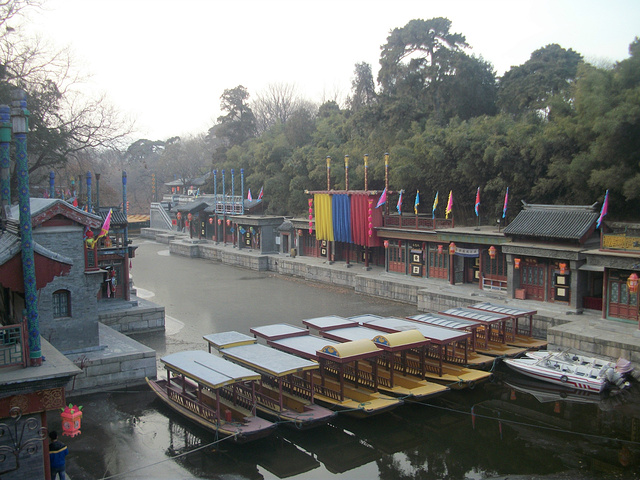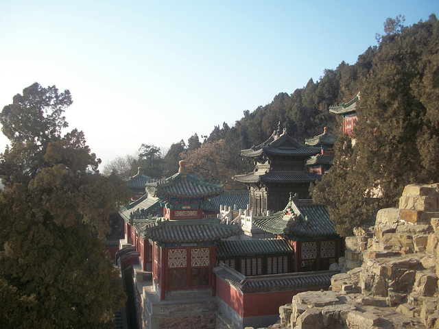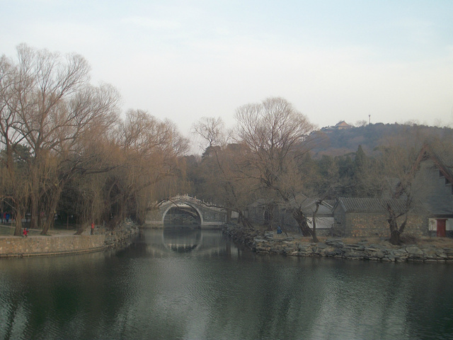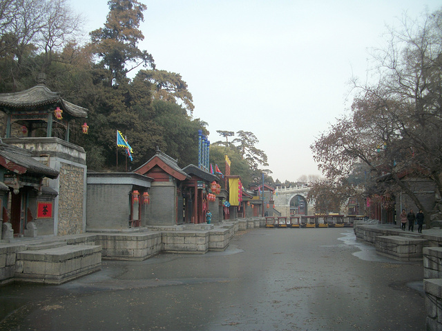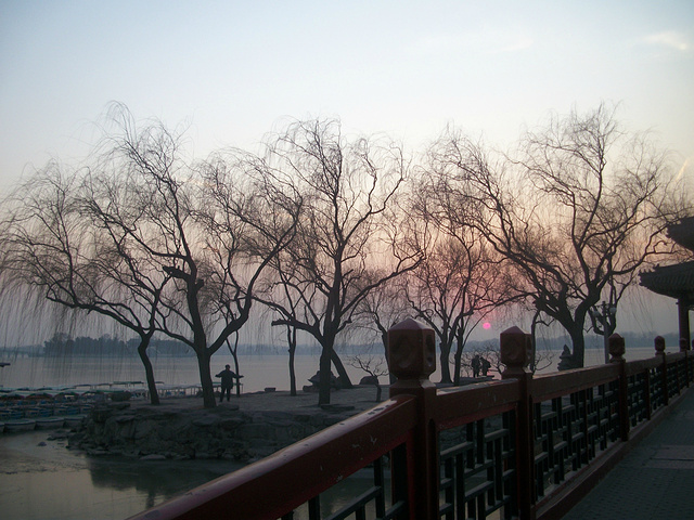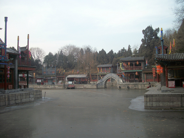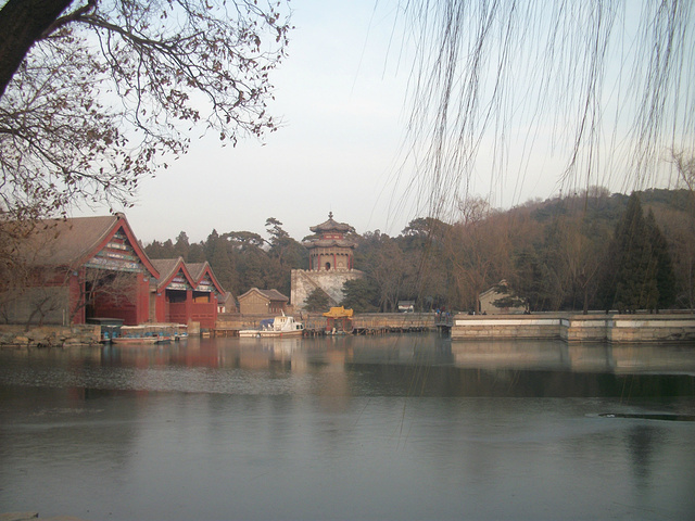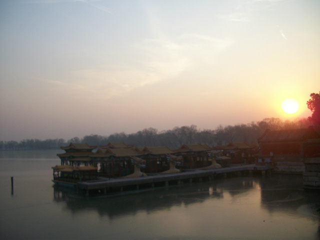 直接在圆明园公车站坐其中一路车到颐和园。因为公车的刷卡机坏了,售票员说有卡直接免费,所以还省了4毛钱。估计除了首都,其他地方也没这么好的事了。 颐和园,北京市古代皇家园林,前身为清漪园,坐落在北京西郊,距城区十五公里,占地约二百九十公顷,与圆明园毗邻。它是以昆明湖、万寿山为基址,以杭州西湖为蓝本,汲取江南园林的设计手法而建成的一座大型山水园林,也是保存最完整的一座皇家行宫御苑,被誉为“皇家园林博物馆”,也是国家重点旅游景点。还是买的联票,50元。建议没去过的话还是不要买联票了,因为在里面买景点的票也是一样的,再说不一定逛的完。我就是没找着文昌院在哪。进去的时候首先在德和园逛了一下,然后沿着长廊走,到了清晏舫。清晏舫俗称石舫, 在长廊西端湖边,是一条大石船,寓“海清河晏”之意,是颐和园唯一带有西洋风格的建筑。 在清晏舫吹了一阵风,往前走了一段,进了佛香阁。佛香阁位 于在万寿山前山中央部位的山腰,建筑在一个高21米的方形台基上,是一座八面三层四重檐的建筑。这里还是值得进去的。上山的阶梯很有特色,本想着从这边上去,一会从另一边下来的,结果直接在山上就出去了,蛮遗憾的。在山顶上逛了一圈,随意看了一下智慧海等地方就往苏州街方向下山。苏州街是后湖两岸仿江南水乡——苏州而建的买卖街。清漪园时期岸上有各式店铺,如玉器古玩店、绸缎店、点心铺、茶楼、金银首饰楼等。现在还是保留了这些特色的店铺,不过因为天气的缘故,游客很少,店铺很少营业。 离开苏州街随意再逛了下,夕阳已经准备西下。拍了几张夕阳照,就离开了。出来后和小五商量了下,打算去王府井步行街会合。于是在颐和园步行约620米,到达西苑地铁站乘坐地铁4号线,经过14站, 到达西单转1号线经过3站, 到达王府井站;也可以乘坐地铁4号线,经过9站, 到达西直门站转2号线,经过3站, 到达复兴门站,转地铁1号线,经过4站, 到达王府井站。