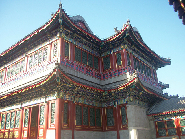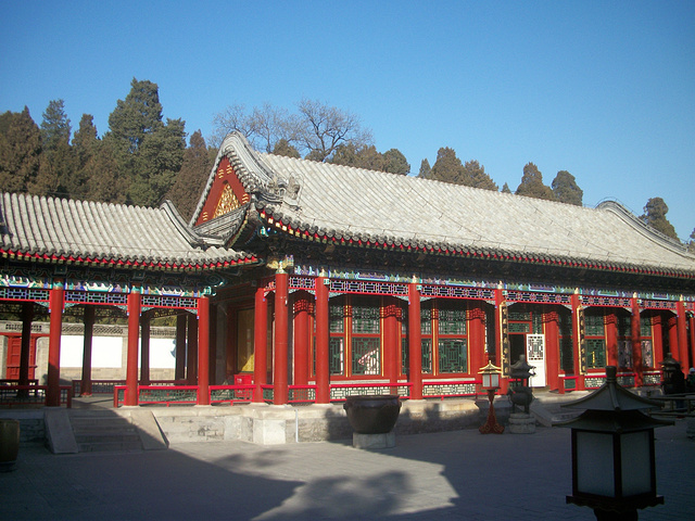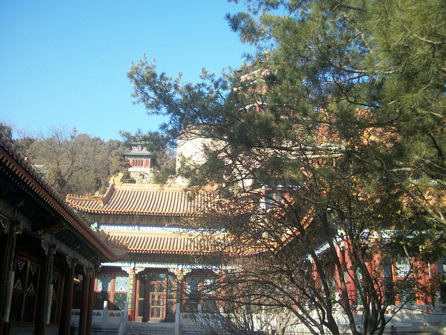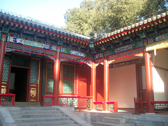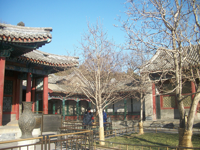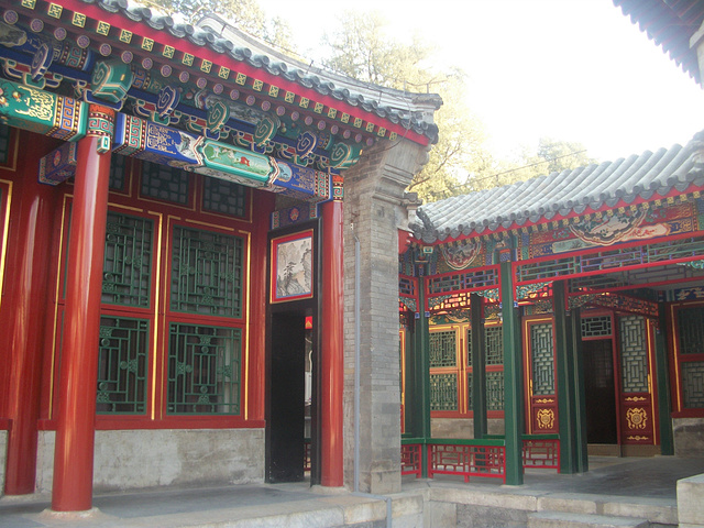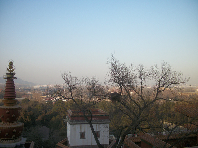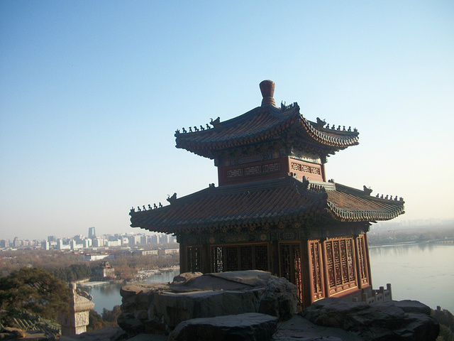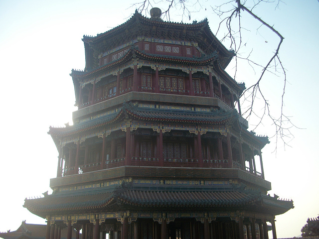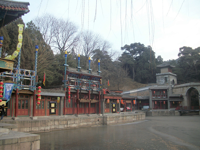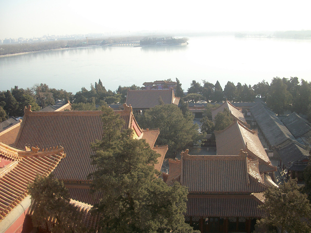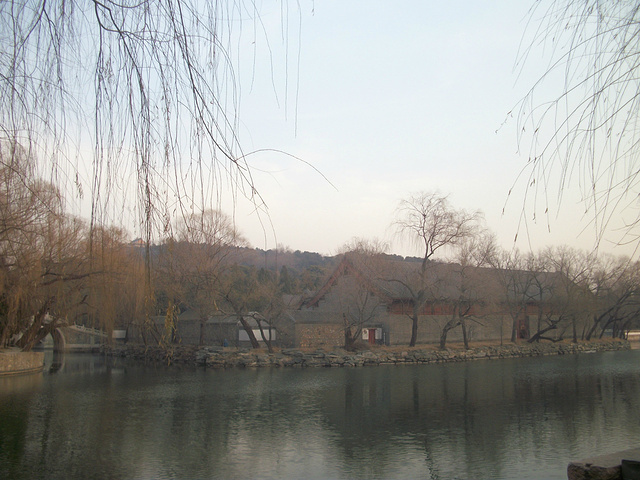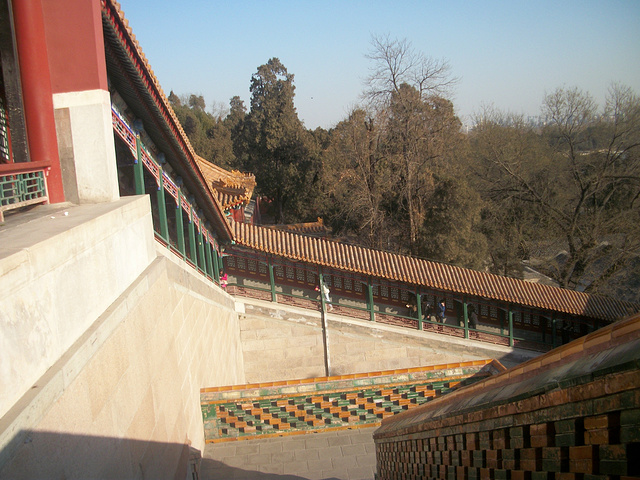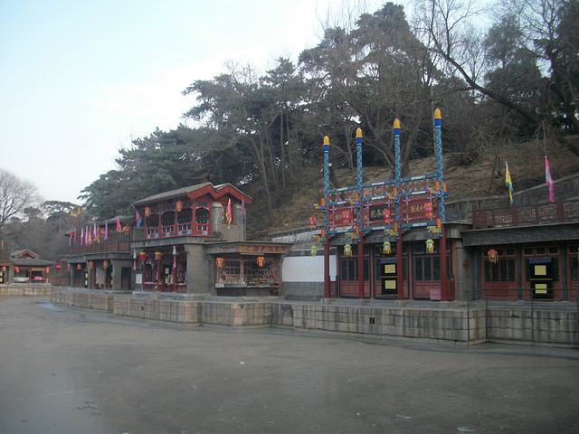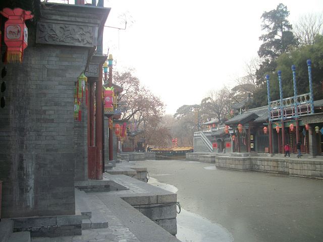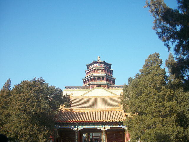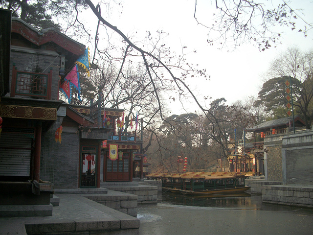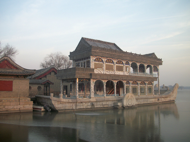直接在圆明园公车站坐其中一路车到颐和园。因为公车的刷卡机坏了,售票员说有卡直接免费,所以还省了4毛钱。估计除了首都,其他地方也没这么好的事了。 颐和园,北京市古代皇家园林,前身为清漪园,坐落在北京西郊,距城区十五公里,占地约二百九十公顷,与圆明园毗邻。它是以昆明湖、万寿山为基址,以杭州西湖为蓝本,汲取江南园林的设计手法而建成的一座大型山水园林,也是保存最完整的一座皇家行宫御苑,被誉为“皇家园林博物馆”,也是国家重点旅游景点。还是买的联票,50元。建议没去过的话还是不要买联票了,因为在里面买景点的票也是一样的,再说不一定逛的完。我就是没找着文昌院在哪。进去的时候首先在德和园逛了一下,然后沿着长廊走,到了清晏舫。清晏舫俗称石舫, 在长廊西端湖边,是一条大石船,寓“海清河晏”之意,是颐和园唯一带有西洋风格的建筑。 在清晏舫吹了一阵风,往前走了一段,进了佛香阁。佛香阁位 于在万寿山前山中央部位的山腰,建筑在一个高21米的方形台基上,是一座八面三层四重檐的建筑。这里还是值得进去的。上山的阶梯很有特色,本想着从这边上去,一会从另一边下来的,结果直接在山上就出去了,蛮遗憾的。在山顶上逛了一圈,随意看了一下智慧海等地方就往苏州街方向下山。苏州街是后湖两岸仿江南水乡——苏州而建的买卖街。清漪园时期岸上有各式店铺,如玉器古玩店、绸缎店、点心铺、茶楼、金银首饰楼等。现在还是保留了这些特色的店铺,不过因为天气的缘故,游客很少,店铺很少营业。 离开苏州街随意再逛了下,夕阳已经准备西下。拍了几张夕阳照,就离开了。出来后和小五商量了下,打算去王府井步行街会合。于是在颐和园步行约620米,到达西苑地铁站乘坐地铁4号线,经过14站, 到达西单转1号线经过3站, 到达王府井站;也可以乘坐地铁4号线,经过9站, 到达西直门站转2号线,经过3站, 到达复兴门站,转地铁1号线,经过4站, 到达王府井站。