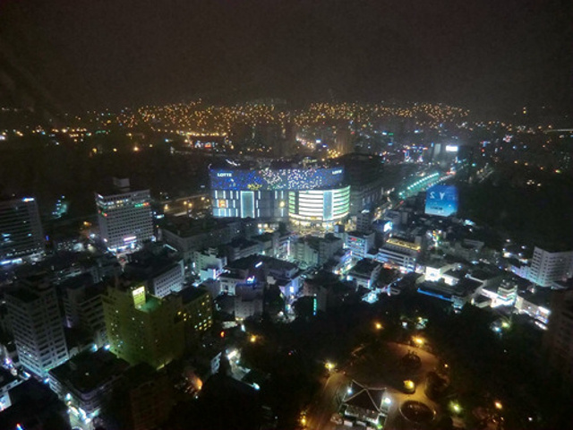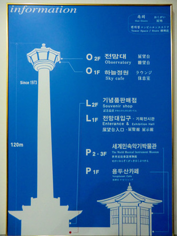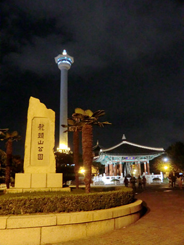 龙头山公园南侧的主入口便在光复路的北侧,有一架长长的免费自动扶梯一直通到山顶,釜山塔便在那里了。花上4000韩元买张门票,便可乘着高速电梯达到120米高的瞭望台上,整个釜山夜景尽收眼底。在瞭望台下面一层是空中咖啡馆,在100多米的高空中的一份冰激凌,为这一天的旅行画上了句点。