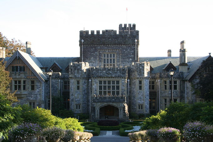 恋恋不舍地离开布查特花园,驱车前往海特利古堡(Hatley Castle)。古堡位于皇家路(Royal Roads)大学内,是前BC省督詹姆斯(James Dunsmuir)在1908年建成。这座20世纪初维多利亚的豪宅,现在则是皇家路大学的行政中心。