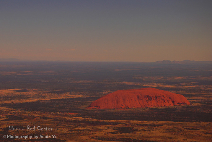 乘坐QF728 上午9:45的飞机从悉尼直飞乌鲁鲁,一定要坐左边的靠窗座位,这样在飞机上就可以首先目睹大石头的巨大的神奇。机上远眺乌鲁鲁~ 红色的的巨石突兀在沙漠之中。