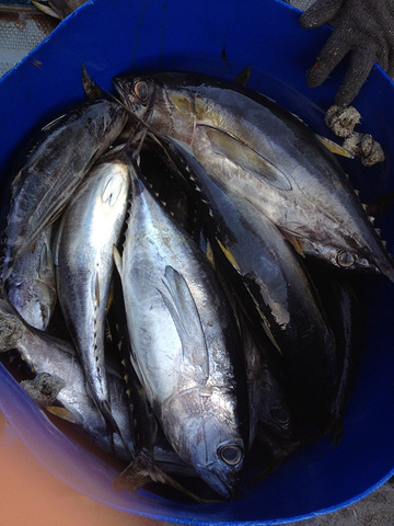 早上渔民在整理打回来的鱼,我很早就出来溜达,在岸上一直看了好久,走开后,我姐也出来溜达碰到一起,就又回到这里,渔民说我们可以上船上去看,基本都是金枪鱼。