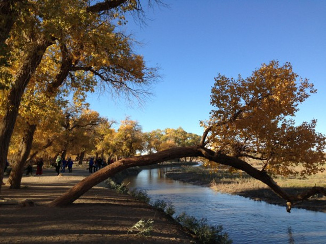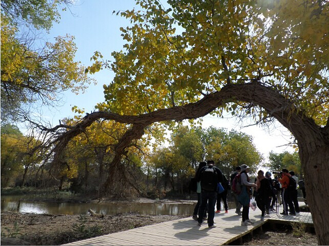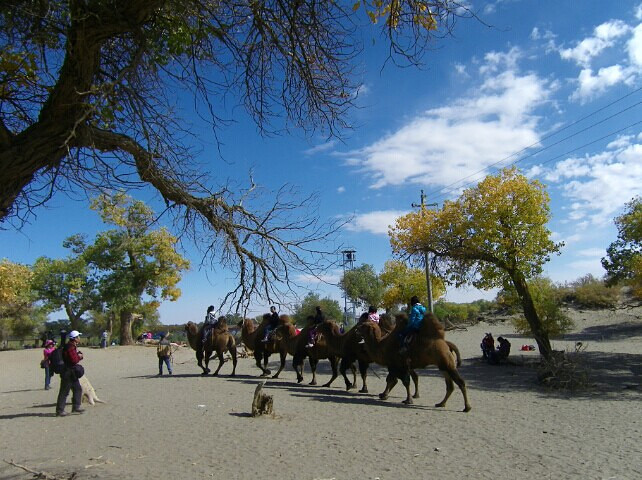 到了胡杨林才发现来早了几天, 许多树叶刚开始黄, 还没到最美的金黄色, 听说是因为天没冷, 如果冷风一刮马上就黄了。 原来想拍落日的, 可走得精疲力尽, 6点多太阳还很好, 又饿了, 就回吧。 买了两个金丝哈密瓜, 又便宜又好吃, 其他吃的这期间都涨得离谱。 到了晚上, 酒店停电, 没法充电和上网, 没了再玩的兴致, 决定明天离开。 正值国庆, 担心买不到票, 第二天起了个早就去买票, 还好有了10班加班车, 买到了10:20的票, 下午5点多到达酒泉, 晚上21:21的火车卧铺去兰州。
