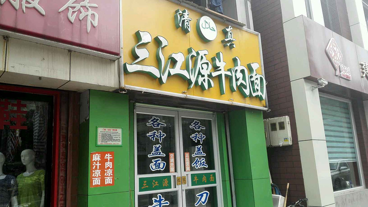 很不错的一家拉面馆,三江源在济南分布蛮广的,很多街上都有,这家在经二纬九,嘉华购物广场附近,位置还不错,118.1.2.等多条线路通过,餐馆面积不是多大,环境卫生可以,空调开放,餐品主要就是牛肉拉面,刀削面,炒饭,盖浇面,盖浇饭,羊肉泡沫,炒菜新疆大盘鸡,土豆炖牛肉,等等~一般拉面8元,刀削面也8元,加肉10元,煎鸡蛋2元,面条还不错,汤清面白,这的辣椒酱很好吃,香而不是太辣~和面条一起十分入味!服务态度也蛮好的,来这边 的可以来看看!