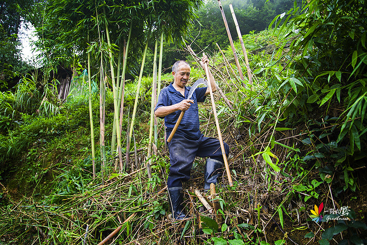 特此感谢这位大爷,我们路过的时候人家正在半山腰砍枯竹当柴火,后来帮我们一人砍了一刻完整的当登山杖用,每根竹子大爷都拿镰刀修的光光溜溜的。大爷真是特别淳朴,那么热的天,把竹子给我们然后就一直笑呵呵的,真的好朴实的大爷。