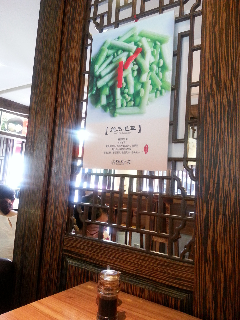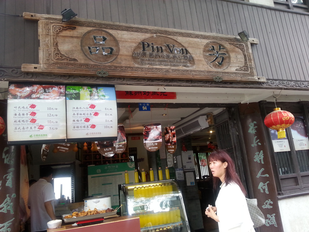 环境优美,味道很赞!在平江路上的一家很有特色的小食店。大部分人可能会选择乘坐公交或者地铁到相门站步行过来,大约10分钟左右。不过我觉得坐公交到醋坊桥观前街东公交站,再沿着大儒巷步行过来会快一些,大约只需5-6分钟左右。而且可以逛完观前商业步行街后,再顺便过来,两个景点可以安排到一起噢!不过有个很重要的温馨提示,就是中饭不要在观前街吃,到平江路吃,不仅钱省了很多,而且味道更加棒!之所以会进入这家品芳,主要是因为它店铺外面的苏式卤汁豆干实在太吸引了,他都是新鲜卤的,然后就放在外面给顾客看,一看就觉得很入味,关键价格还非常便宜,5元就有两大块了!味道就如卖相一样,非常棒!卤汁很入味,而且豆干很有弹性!其实我们吃了很饱的中午饭了,但是还是抵不住诱惑,又叫了一份叶氏鸡爪,也同样卤味很足,爽口弹牙,而且才10元一份!整个餐厅的环境很好,依河而建,整个店铺都以木为设计。例如木柱子、木椅子、木桌子等等。墙上还有挂了很多有诗意的美食图片。其实除了卤味以外,品芳还有很多苏式小吃,例如汤包、春卷、生煎包、酒酿园子等等著名小吃,但是我们当时真的好饱了,所以就只能放弃了,不过我们下次一定会再来吃的。