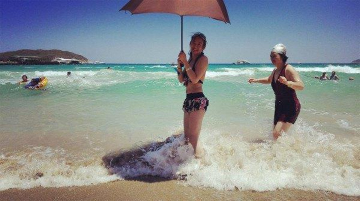 和家人在海里玩耍,一次次的海浪涌过来,我们手牵着手,尽量不让海浪打翻我们。 我们欢笑,我们胡闹。感受大海带给我们的欢乐和旅行带给我们短暂的遗忘。 时不时地,海浪太大,我们都会被淹没在海水里,然后再挣扎着从海水里探出头去寻找家人的影子。海水咕嘟咕嘟的声音现在还记忆犹新。