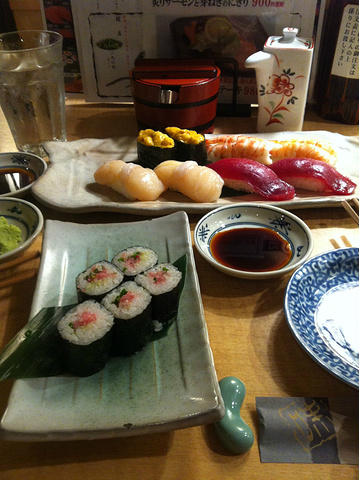 后来天气不好了,下大雨,我们就回酒店小休息了一阵子。晚上大概7点的样子看雨小了点才出门,到银座买买买!逛了三越百货,收获了一件burberry蓝标裙子,29000日币。老公觉得日本的上班族拎的公文包很潮,买了一个牛皮的,26000日币。帮同事在tiffany买了3条项链(但这个价格并没有太大的优惠),就去了临街的一家寿司店。虽然是随便选的,但出乎意料的好吃,人气爆棚,进店门以后才发现满座啊。 点菜的时候超级蠢,menu上每一种寿司都画了2个,然后标了一个价格。当时不懂,觉得好便宜啊,服务员来了以后和我一讲才明白,然后我还是按照老思维每样来2个。吃着吃着就觉得自己蠢哭了,既然menu上都是一份的价格,为毛一个来份尽量多点一些,还每样来2个,这是要彻底坚持平均主义么。。。。。后来还加了一份人气厚煎三文鱼,好在很新鲜很好吃,第二天也没有拉肚子,那就是真的新鲜了。这是在东京吃的最好吃的,将近4000日币,其实也没多少钱,但真心好好吃,现在都能想起味道来。