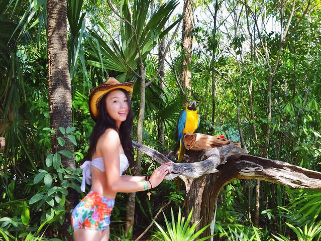 因为跟团游,时间很紧,我们还没来得及逛逛海滩,就必须离开赶去下一个景点。希望下次能自驾来,能多些时间在海边走一走。 Xel-Ha在图伦附近,是个All-Inclusive水上乐园。虽说是all-inlcusive, 也只是包括吃喝和浮潜,还是有很多“和海豚游泳”,“深潜”之类的付费项目。我们到Xel-Ha已经时中午,先是饱餐了一顿,然后换衣服准备去浮潜。Xel-Ha的Snorkel(潜水管)是一次性的,干净卫生,用完之后还可以带走留作纪念。公园里景色很美,满满的加勒比风情。Xel-Ha还贴心的在每个有美景的拍照景点放上有相机标示的小牌子,提醒游客们记得拍照留念。先上图吧~