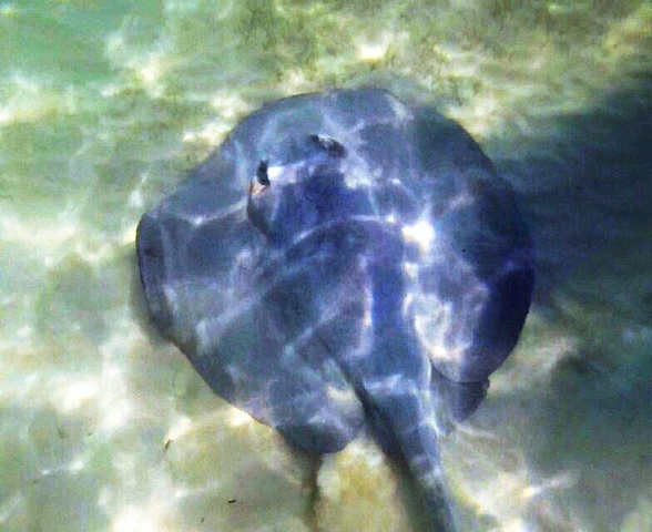 遇到一只不知道叫什么名字的巨型半边鱼。就姑且叫它蝙蝠侠吧~ 追着它游了好久,从岸这边游到岸的另一边,直到它躲进石头缝里,然后我撞上铁丝网