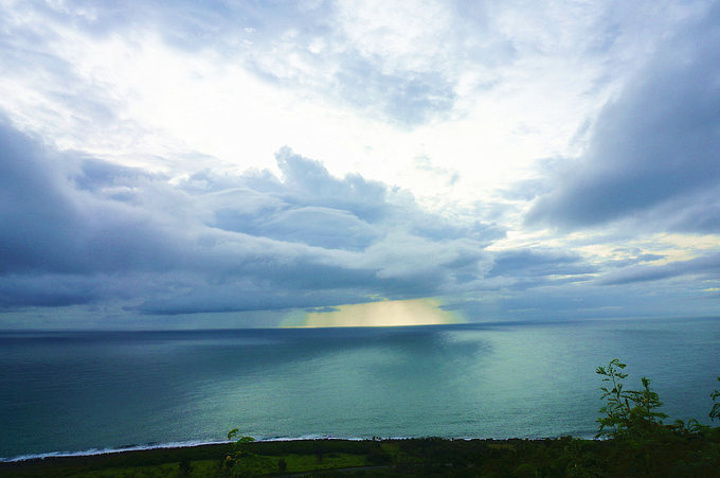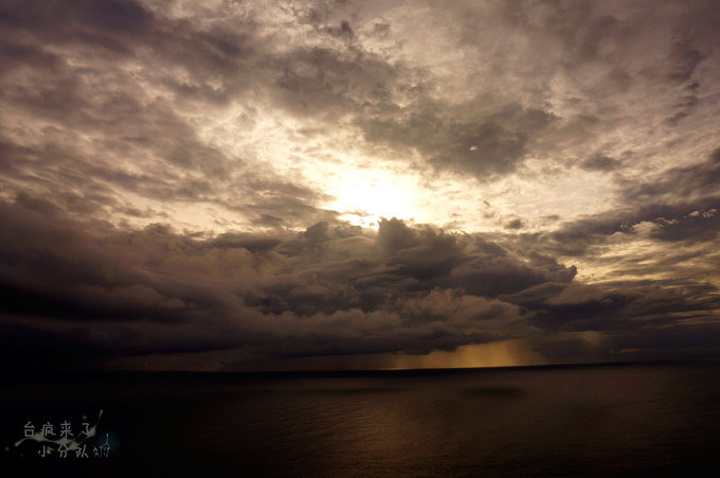 关山落日曾被CNN评选为全球12大最美落日,但能不能得见完全是靠运气的。等了不久,天色渐暗,我们没等来一颗大咸鸭蛋黄似的壮丽落日,却等来了这样一幅美景。 云壮阔地奔腾翻涌,厚厚的云层遮住了阳光,但又被阳光打亮了边缘,大朵的云块中间呈现出深蓝的感觉,而边缘又被镶上金边,显得更为立体。而远处海平面上,云默契地给了一个洞,让一束阳光透下来,就像天漏了恩泽一般,神圣又瑰丽。