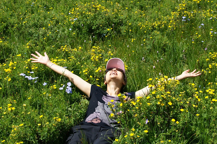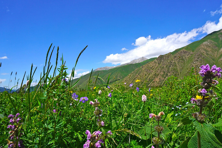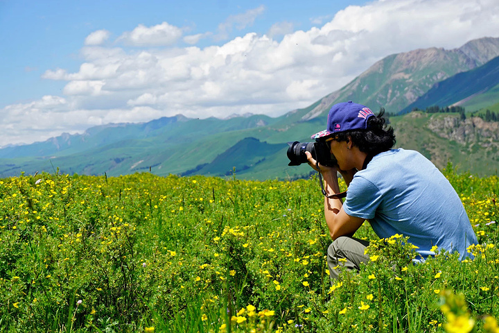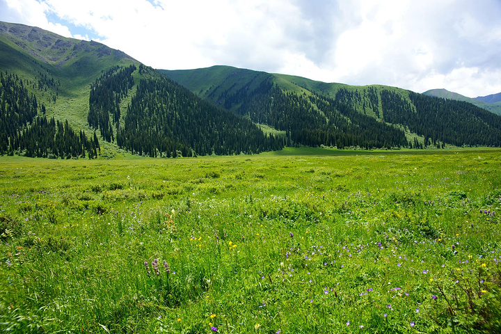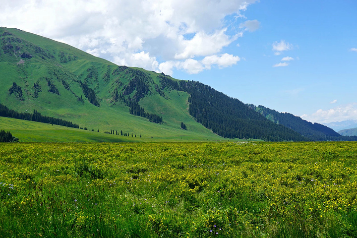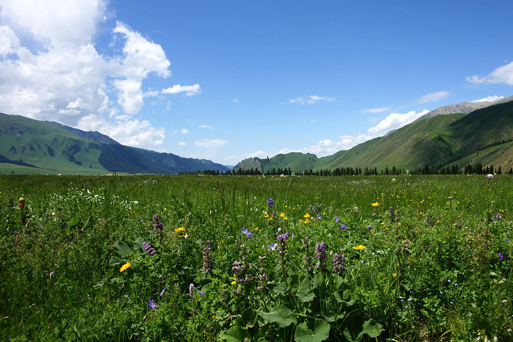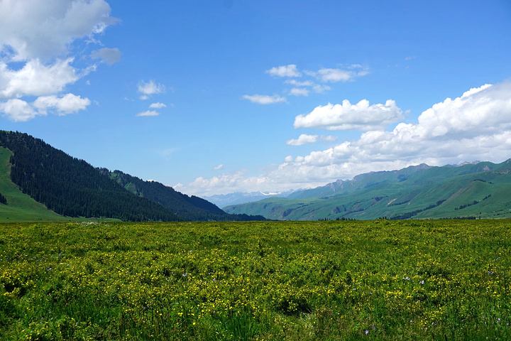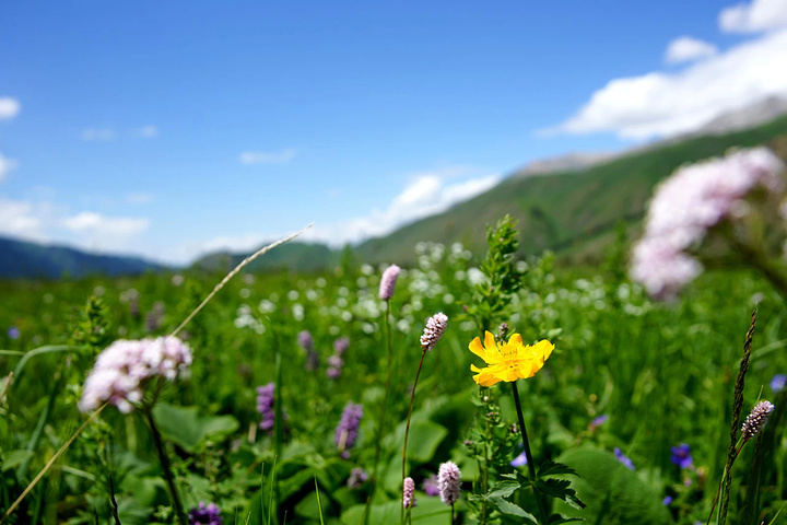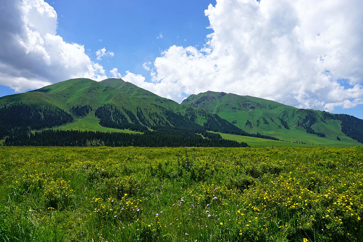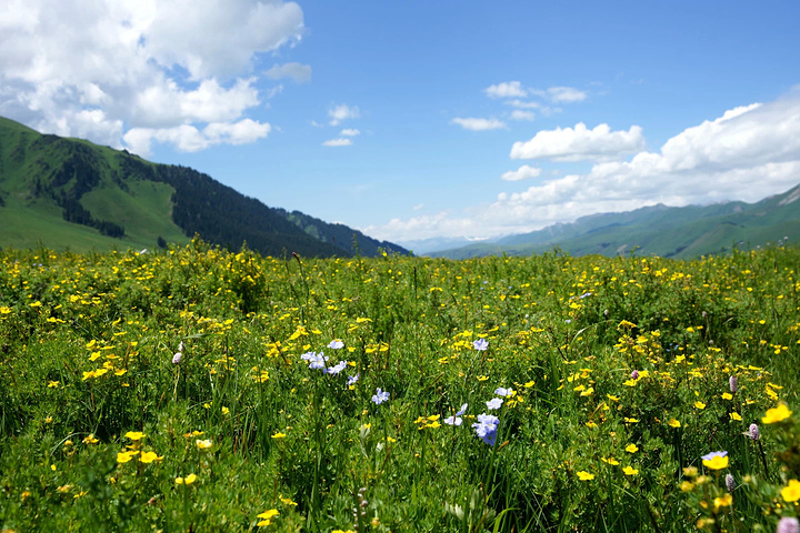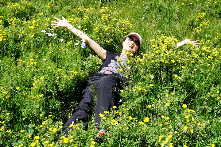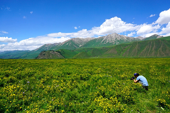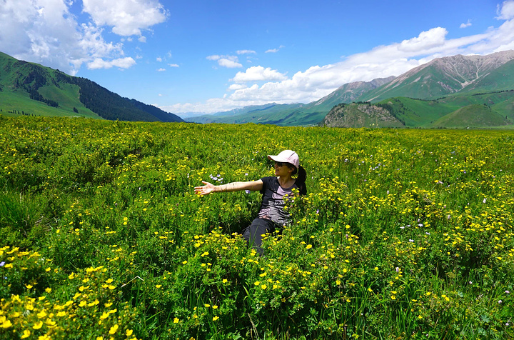 新疆的草原真是太美了,被称作空中大草原真是太贴切了,我们穿梭在高高的山间,山上覆盖着一层绿茸茸的草甸,感觉自己就是在空中的大草原上开车啊,尤其 是开到一个高山垭口,可以望见眼前连绵不断的群山全穿着生机勃勃的绿色外衣,那种振奋、那种欣喜真的是难以用言语来表达。 穿梭在这立体的草原之中,我们不时还会经过大片大片的花海,花海用在这里是再恰当不过的,一望无际的野花漫山遍野,这不就是花的海洋么?平生第一次见到这么大面积的野花,我简直是醉了,醉倒在花丛之中……