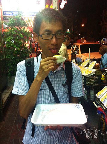 不过不管多艰难,路边的新鲜榴莲是无法拒绝的。这里的路边有很多小摊,摆着很多新鲜水果,菠萝、菠萝蜜、香蕉神马的,但是最吸引我们的还是那“香”飘万里的榴莲。很庆幸小分队四人都是重口味,对这水果之王均是爱不释口。街边的榴莲超级新鲜,价格确实便宜得惊人,这一盒四大块榴莲,一共才180B,这在国内超市,那是买榴莲皮的价啊... 猥琐的海子正在倾情表演,如何猥琐一块榴莲。