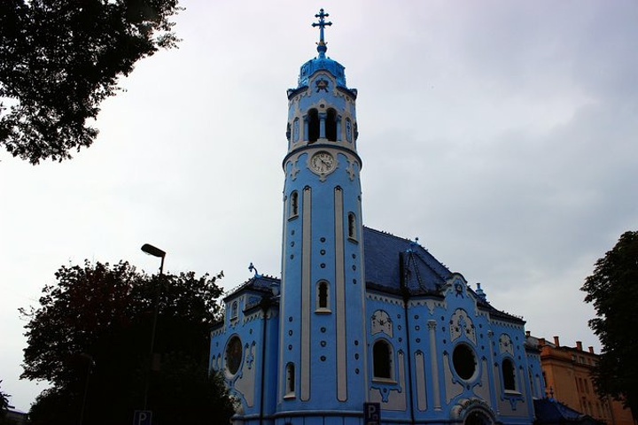 在布拉迪斯拉发的古城区东侧,有一座新艺术风格的蓝色教堂,它是为了纪念13世纪时匈牙利王国的公主伊丽莎白而建的。所以这座教堂又被称为圣伊丽莎白教堂。 今天教堂里面有一对新人正在举行婚礼,所以无法进去参观。