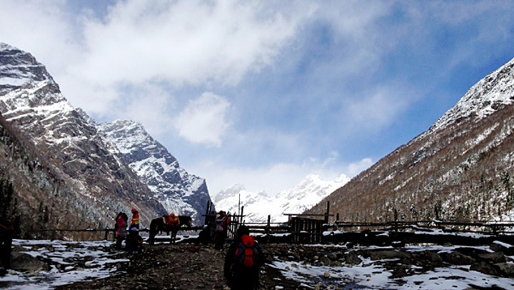 走这条沟把小伙伴累坏啦,小绾也骑了一会儿马,不过当我们走到木骡子,看见近在咫尺的四妹妹、骆驼峰、婆渺峰的时候,一切疲劳都是浮云…这就是传说中的“身体在地狱,眼睛在天堂”吧!