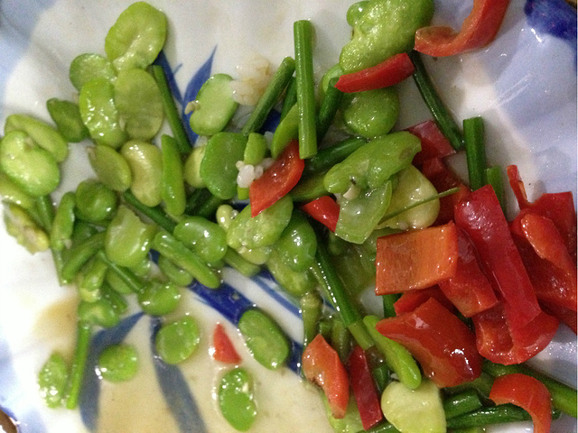 清炒蛇豆,看起来很像蚕豆,是云南当地特产的豆子,很糯,拿盐和清油略微一炒,就香味四溢