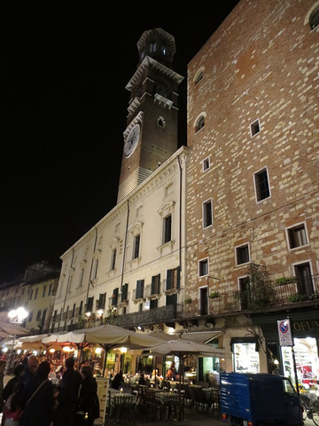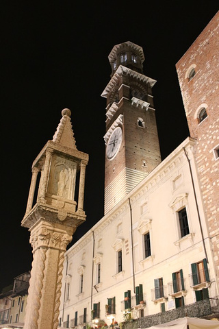 夜色下剑指苍穹的塔峰是在暗示着什么吗?高塔是兰贝尔蒂塔(Torre dei Lamberti),是维罗纳的标志性建筑之一,建于12世纪,实际上在1463年才完工。塔楼只是法理宫 Palazzo della Ragione (Palazzo Forti) 的一部分,法理宫从2007年开始成为了维罗纳的展览中心,经常举办重要的艺展。如果想更多的了解维罗纳,白天不妨去看一看,也可以登塔远眺,将整个维罗纳古城的美景尽收眼里,还可以远眺阿迪杰河两岸的美妙风光。