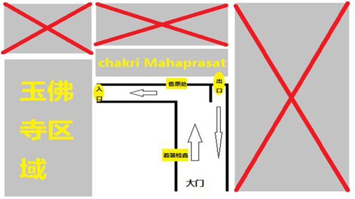这是一份大皇宫地图简版,其中打叉部分就是禁止进入的,“玉佛寺区域”是可以参观的,“Chakri Mahaprasat”区域可以进入,但不能进入建筑参观,另有一个区域是周末关闭的,由于我们是周末去的,所以不清楚情况。