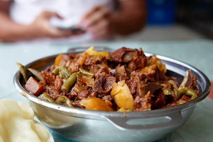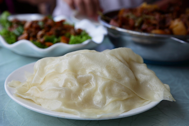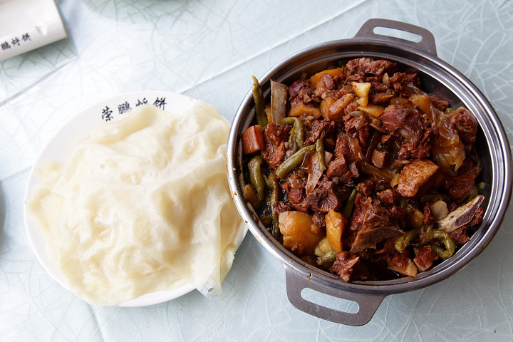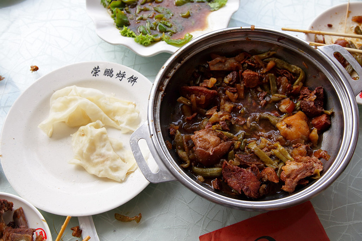 到房间稍作休息,我问女儿饿不饿,她点点头,于是我们步行到荣鹏烀饼,5分钟左右。 这家饭店在锦州非常出名,很有特色,32元一份,份量十足,典型的东北菜,上边一层密密的排骨,下边土豆豆角粉条都很入味软烂。配上一份薄饼,薄到透明,到这的人都不吃米饭,都是吃饼,这份菜带的饼可以随便加。 味道咸香,无论是菜品还是味道都十分符合东北人的口味。难怪会在锦州开这么多分店